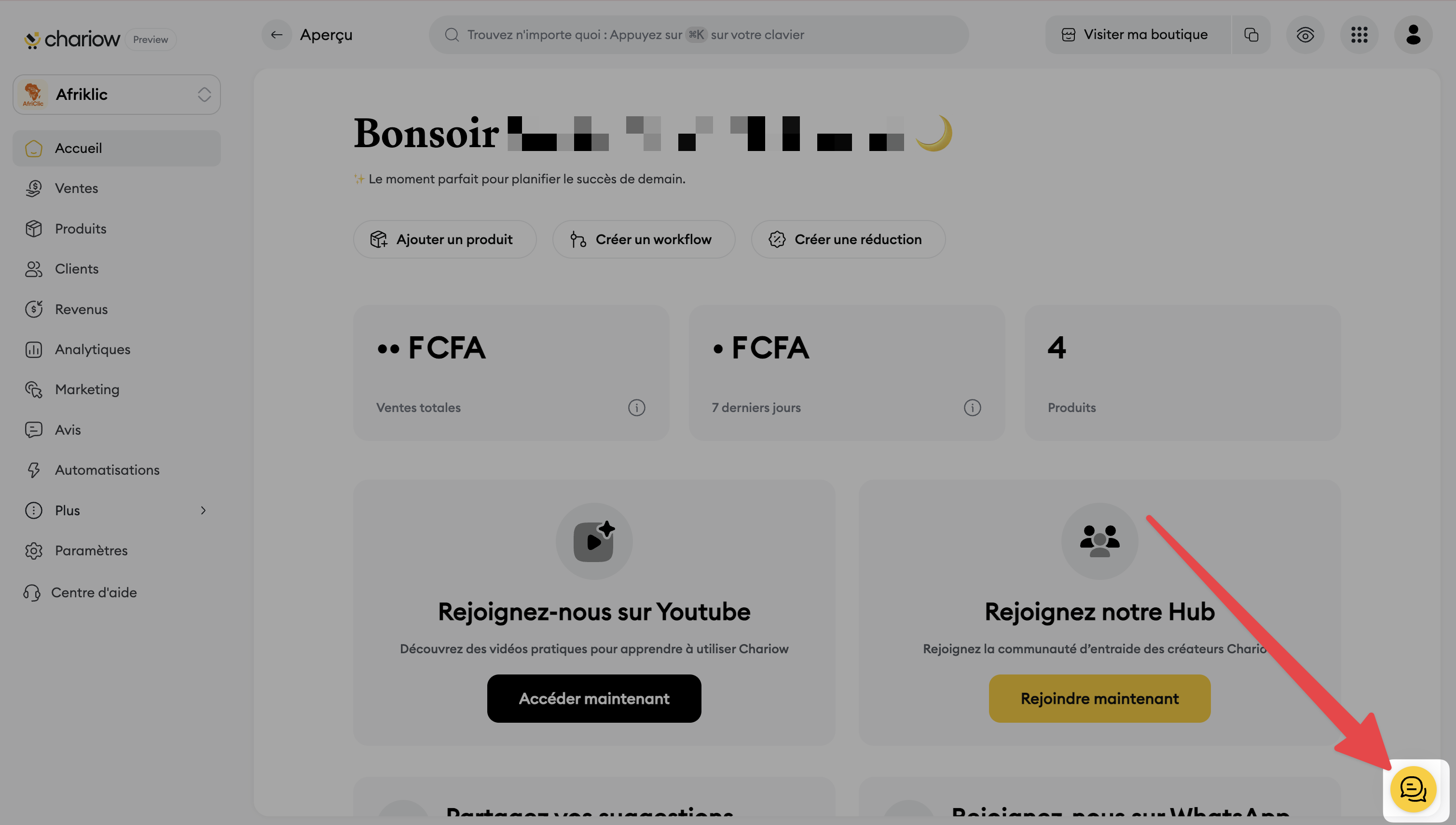 Accès : Via le chat directement depuis votre tableau de bord Chariow ou par e-mail à [email protected].