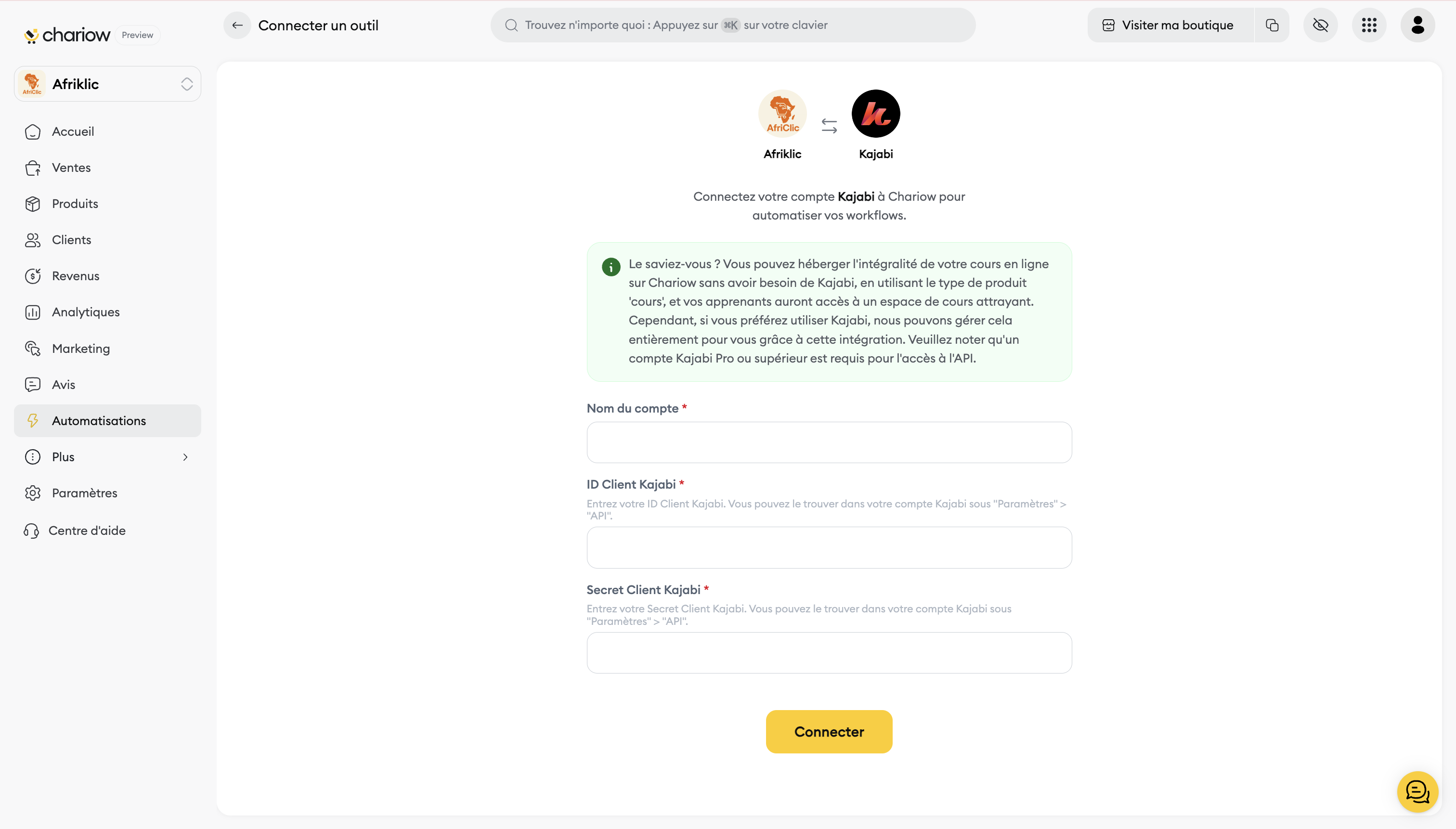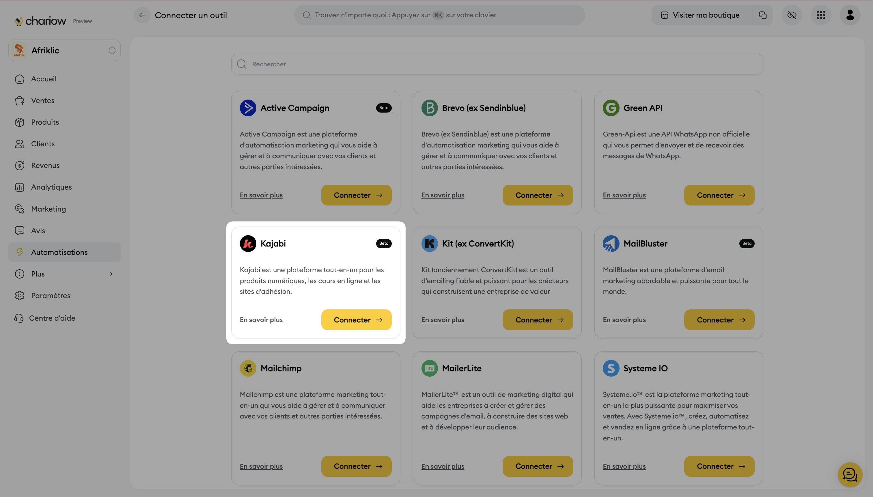 Cet article vous guide pas à pas pour intégrer Kajabi à votre boutique Chariow.