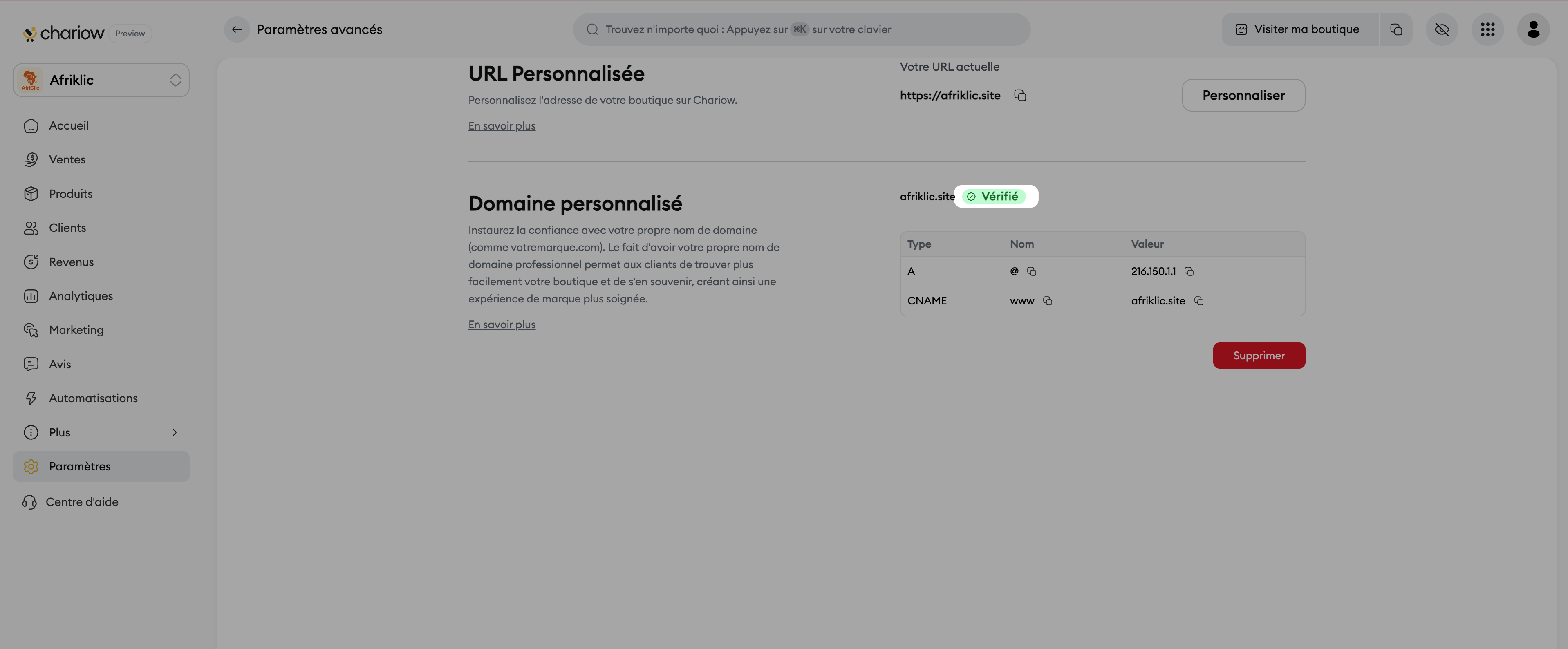 Une fois ces modifications effectuées chez votre fournisseur de domaine, retournez sur Chariow et cliquez sur "Vérifier".