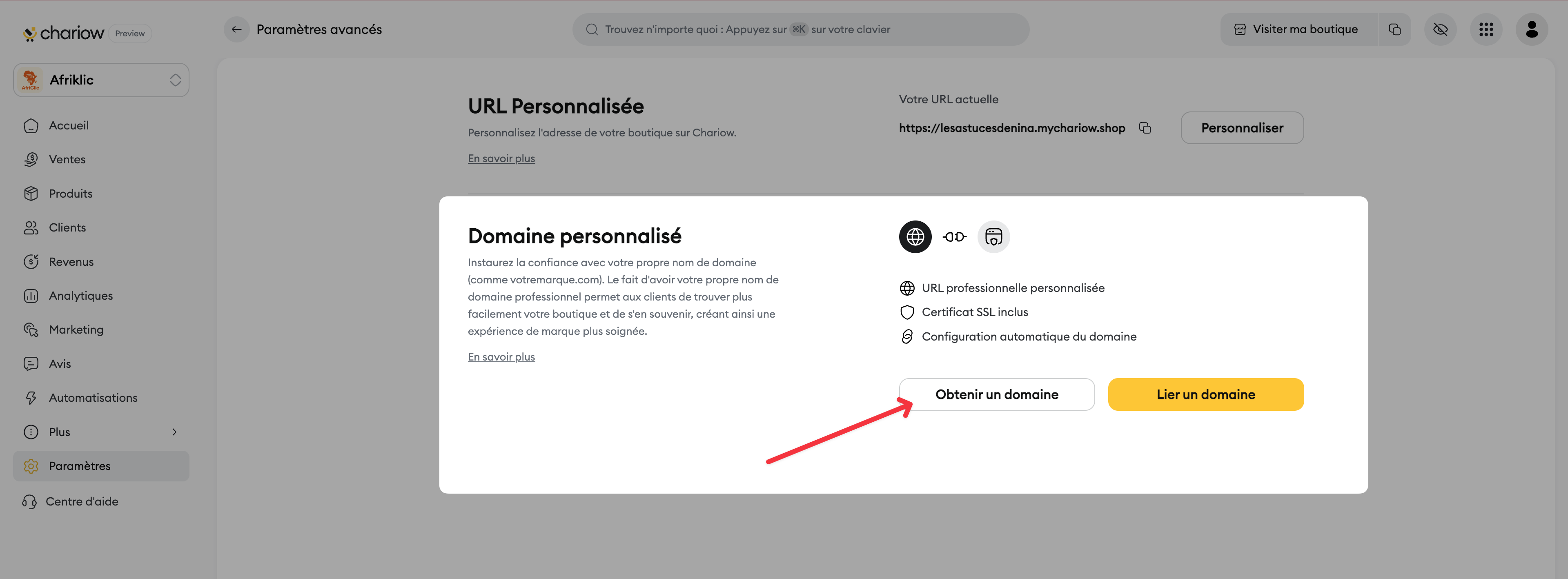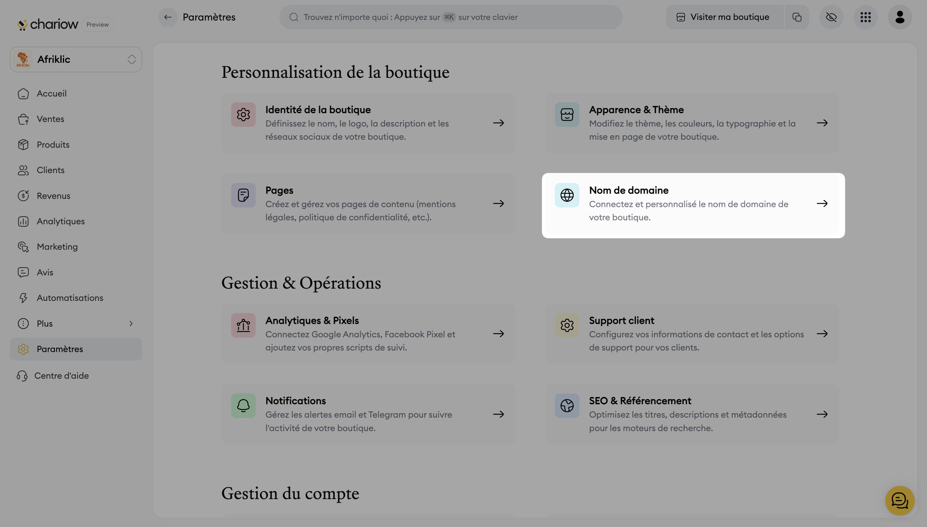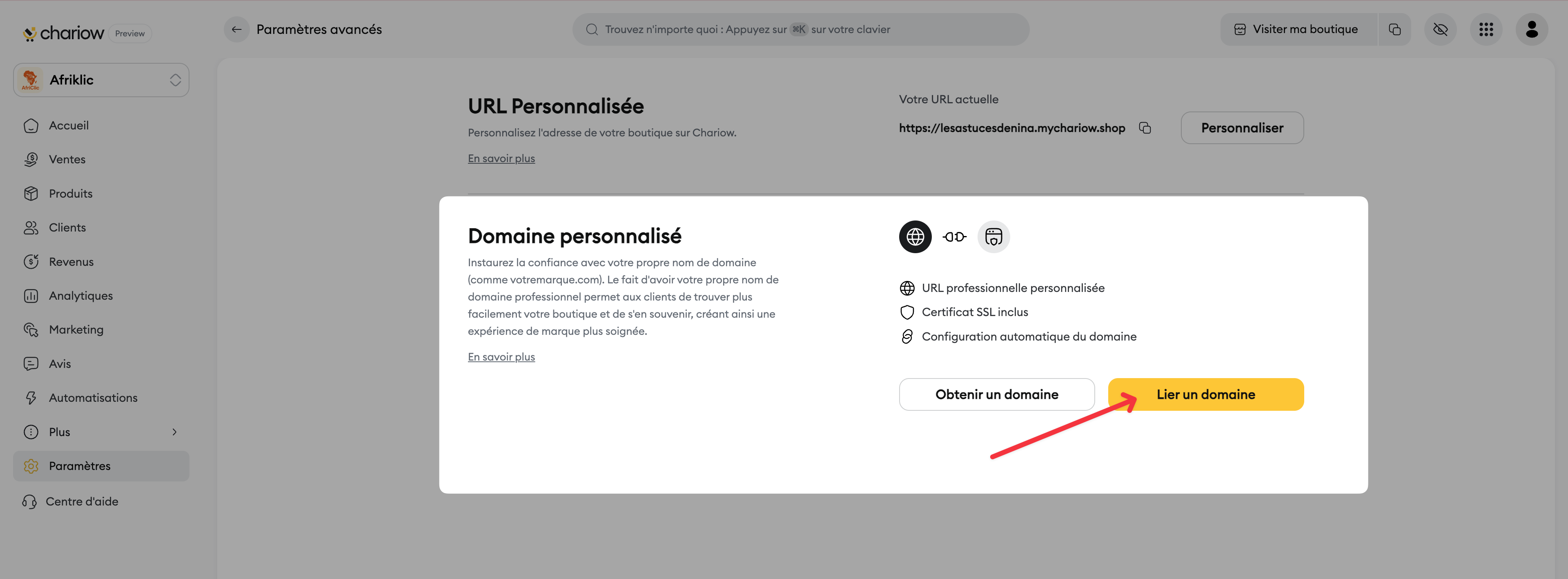 Connecter votre propre nom de domaine (par exemple, votreboutique.com) à votre boutique Chariow est une étape essentielle pour renforcer votre marque et professionnaliser votre présence en ligne. Cela inspire confiance à vos clients et facilite leur accès à votre boutique.