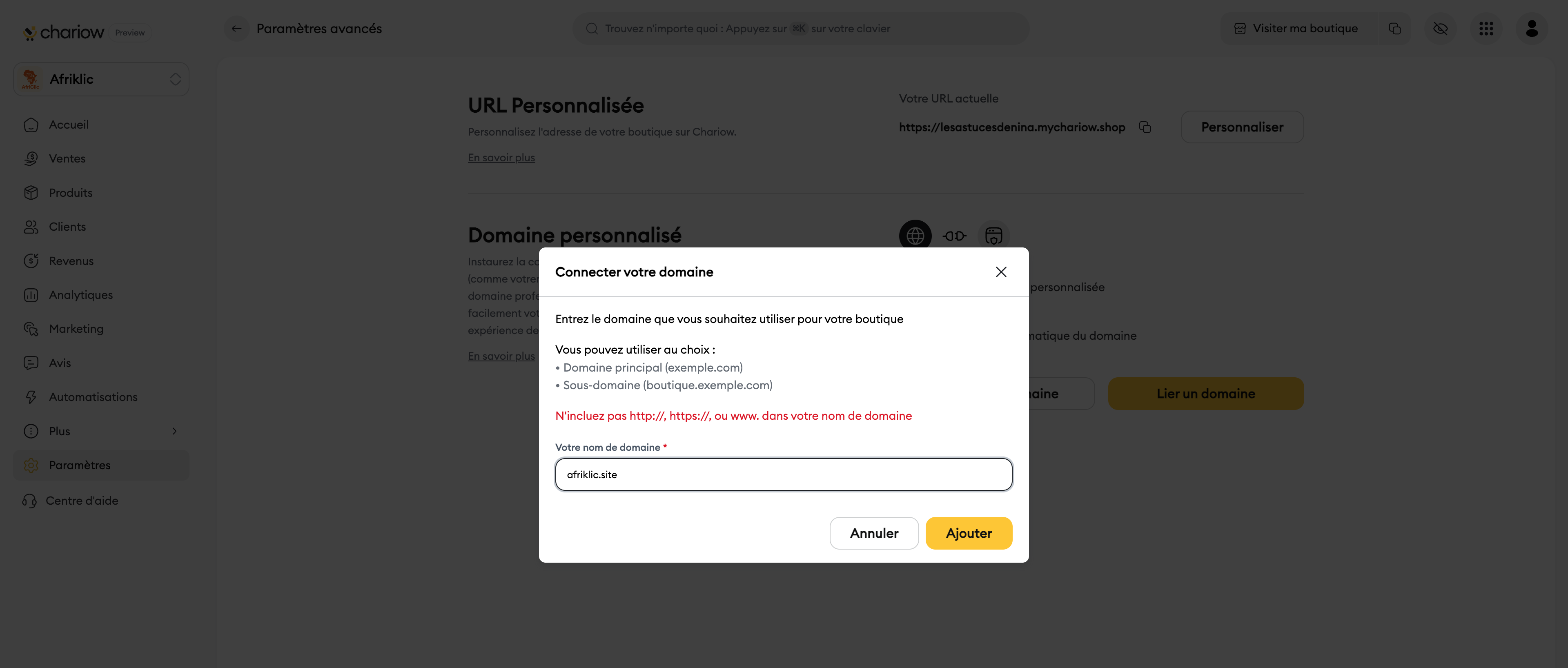 Dans le champ "Votre nom de domaine", entrez votre nom de domaine ou sous-domaine (par exemple, afriklic.site ou boutique.afriklic.site). N'incluez pas "https://" ou "www".