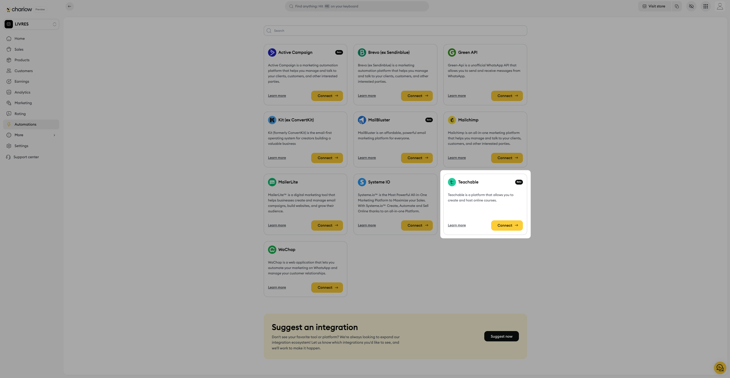 On your Chariow dashboard, go to the Automations section, then click on Integrations.