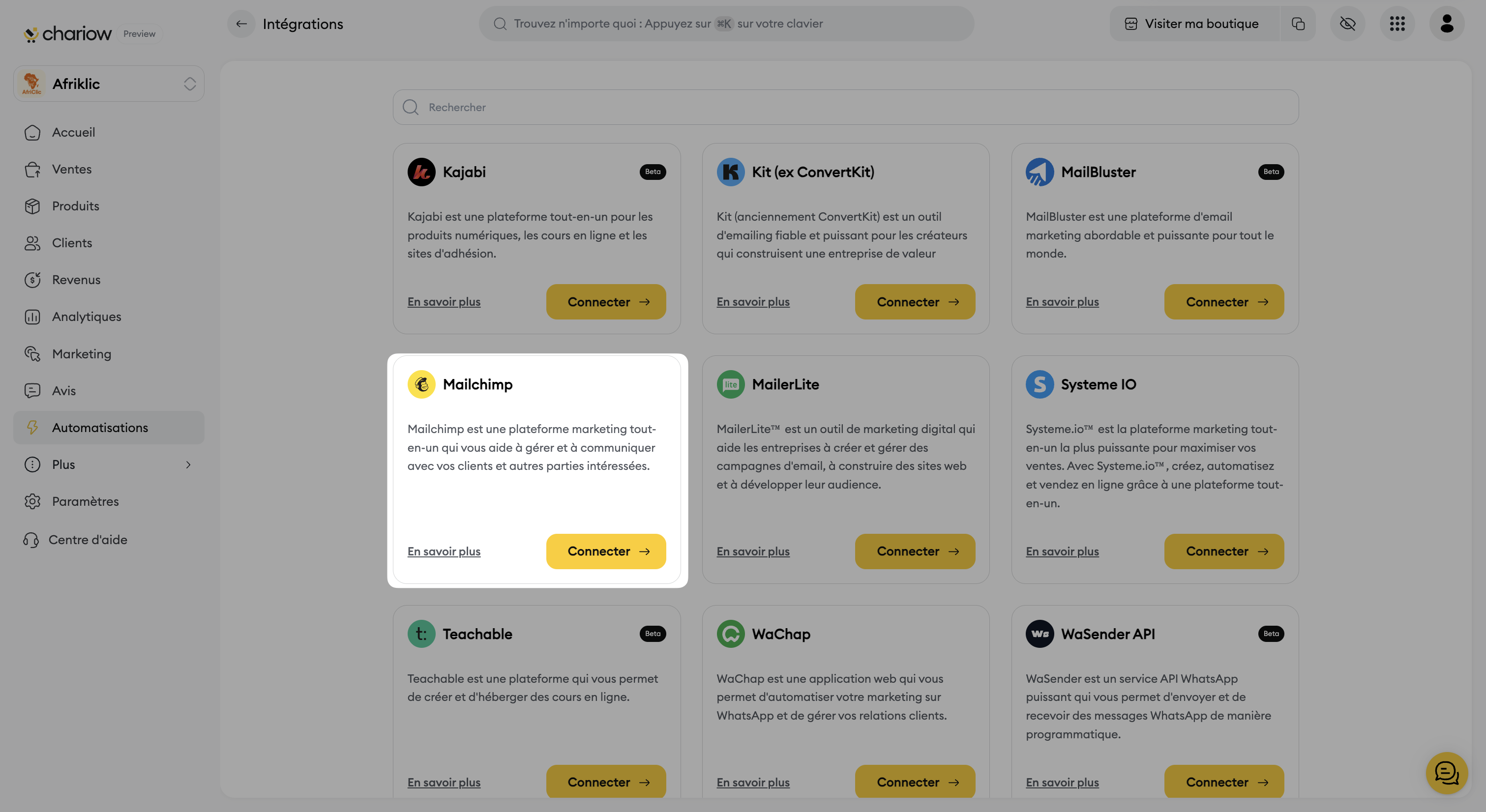 Campagnes e-mail ciblées : Utilisez les données de Chariow pour segmenter votre audience dans Mailchimp et envoyer des communications ultra-personnalisées (offres, nouveautés, relances).