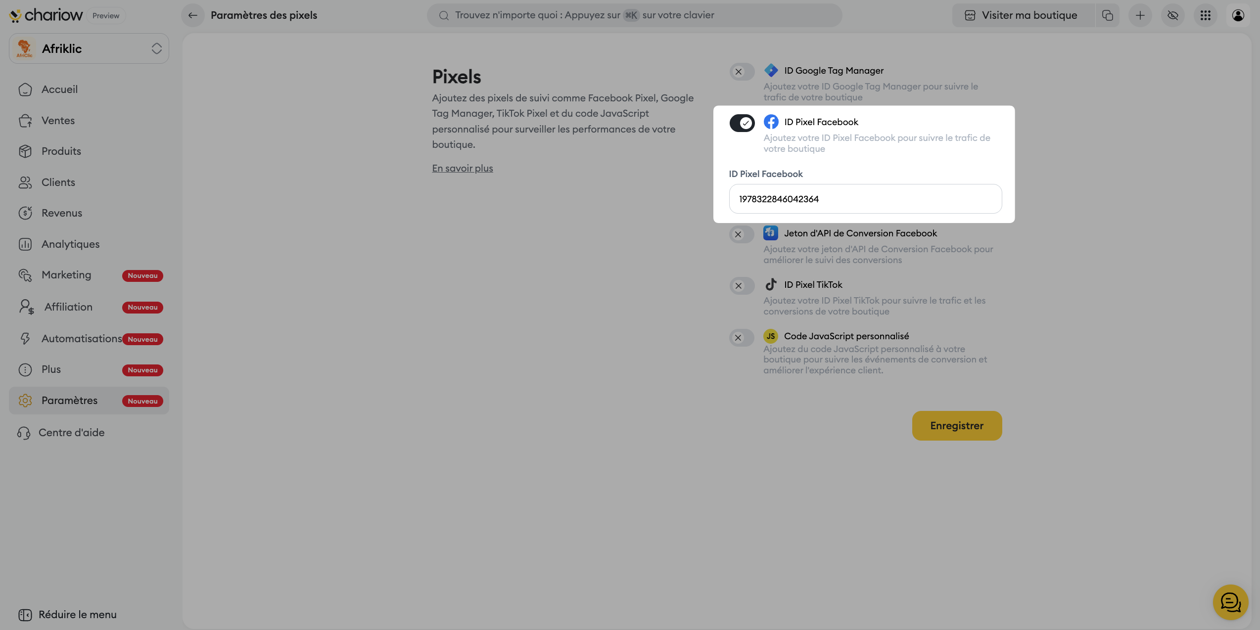 Une fois l'identifiant ajouté et enregistré, Chariow commence automatiquement à envoyer des événements de base à votre Pixel (Page View, Purchase, etc.).