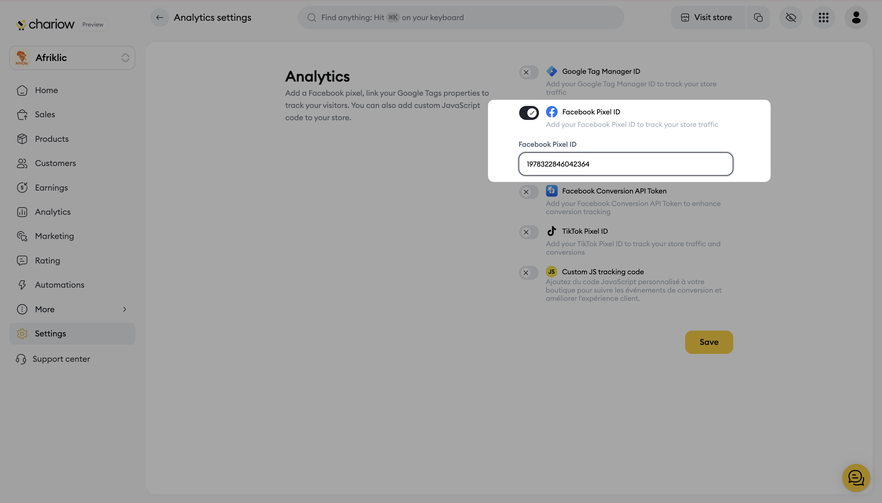 Once the ID is added and saved, Chariow will automatically start sending basic events to your Pixel (Page View, Purchase, etc.).