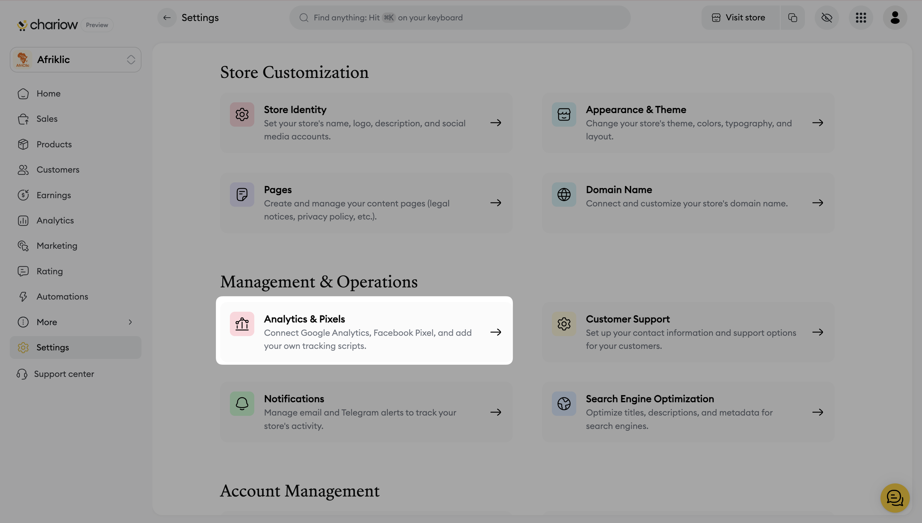 Go to Settings then head over to the Analytics & Pixels section in Management & Operations.