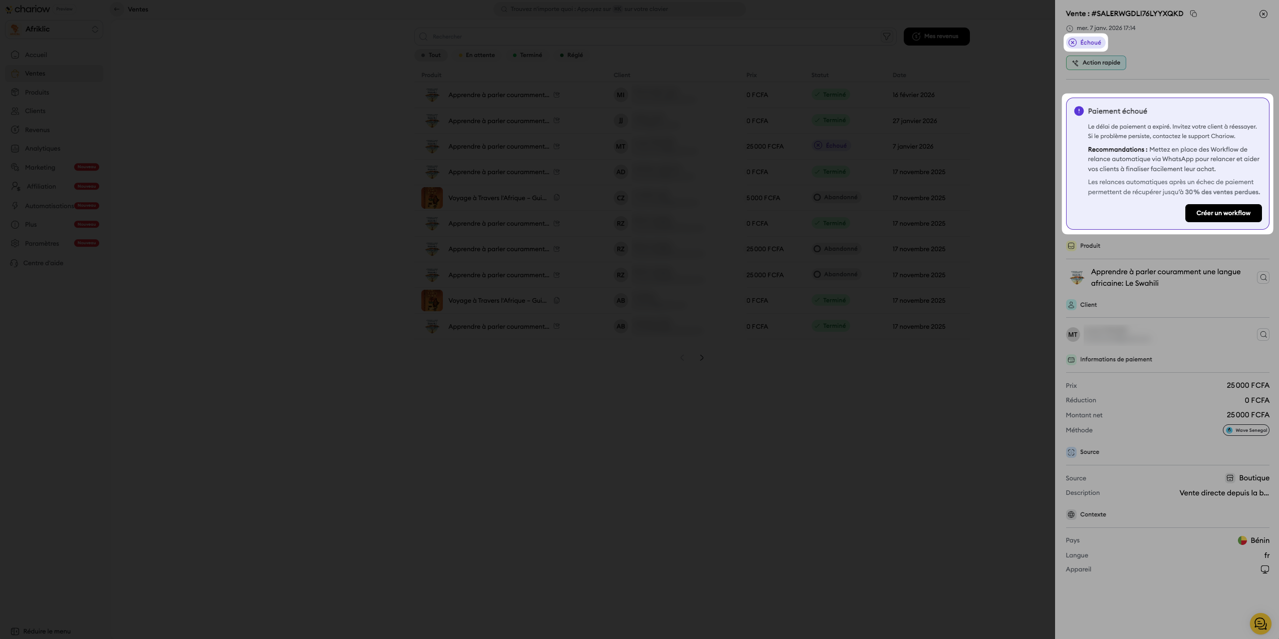 Lorsqu'une transaction échoue, il est crucial de comprendre la raison de cet échec pour pouvoir agir en conséquence, que ce soit en contactant le client, en le relançant grâce aux workflows ou en ajustant les paramètres de votre produit. Chariow vous permet de consulter facilement le motif précis de chaque paiement échoué.
