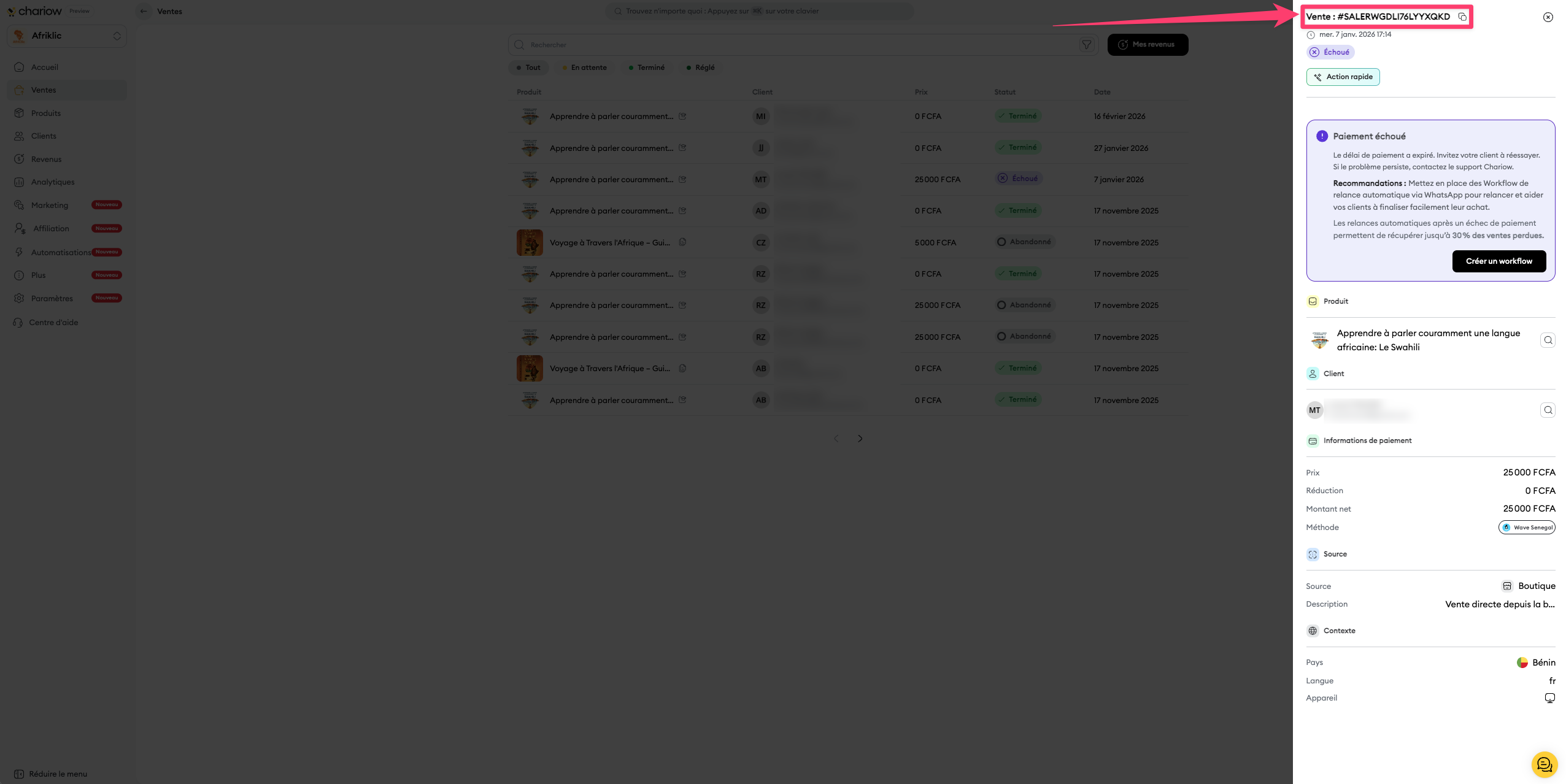 L'ID d'une commande est un identifiant unique attribué à chaque transaction sur Chariow. Cet identifiant est essentiel pour le suivi, le support client ou la vérification d'un paiement, notamment en cas de vente échouée.