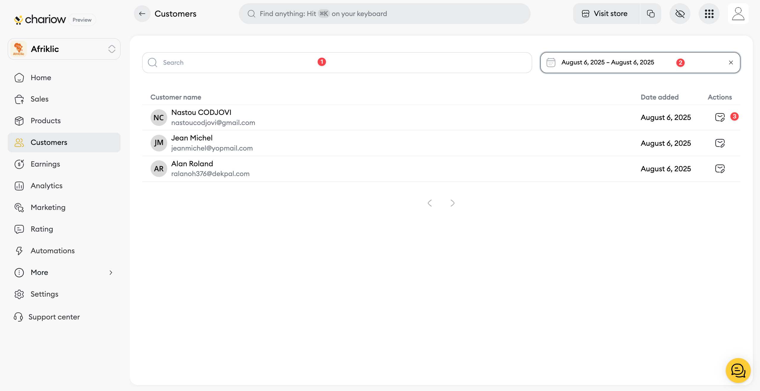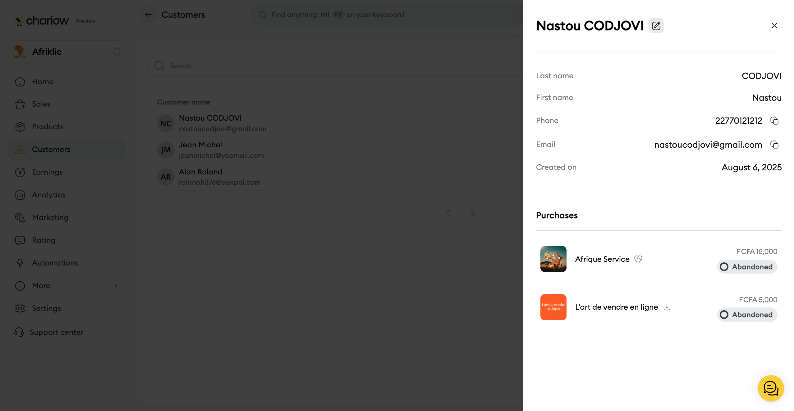 The "Clients" section lets you view and manage everyone who made a purchase in your Chariow shop. It's a handy tool to keep track of your customers and build lasting relationships.