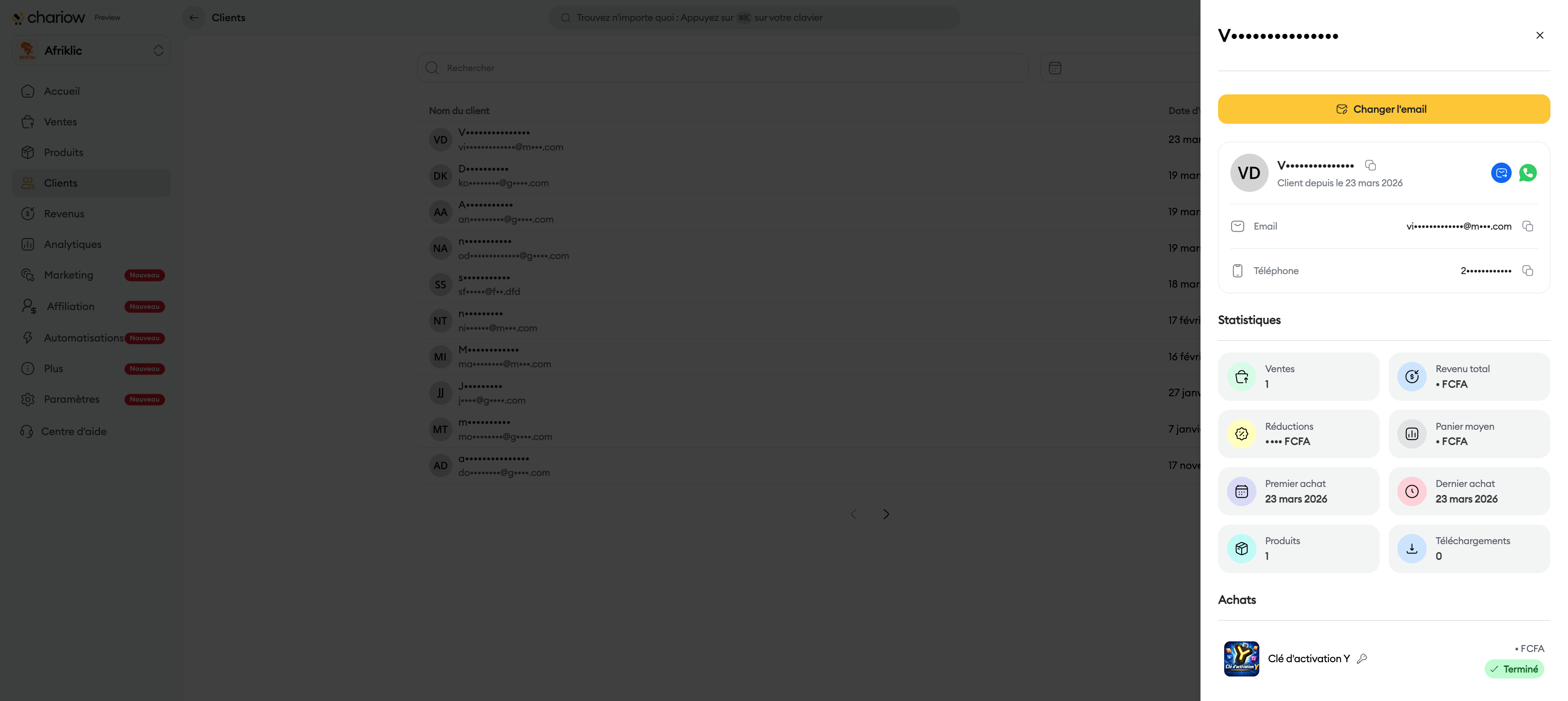 La section "Clients" vous permet de consulter et de gérer l'ensemble des personnes qui ont effectué un achat sur votre boutique Chariow. C'est un outil précieux pour suivre votre clientèle et bâtir des relations durables.