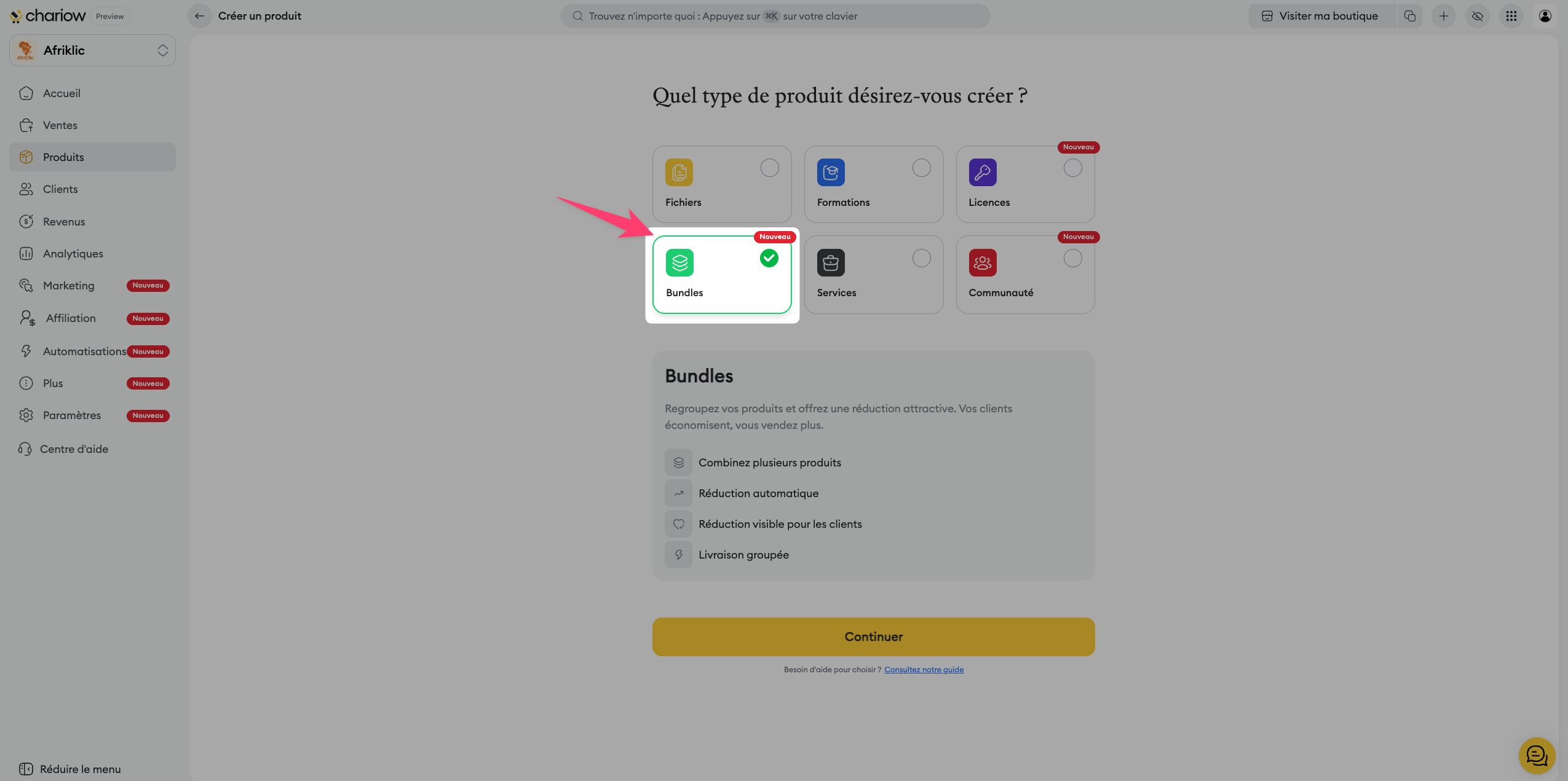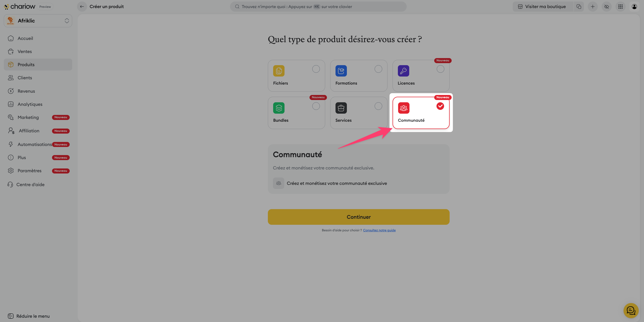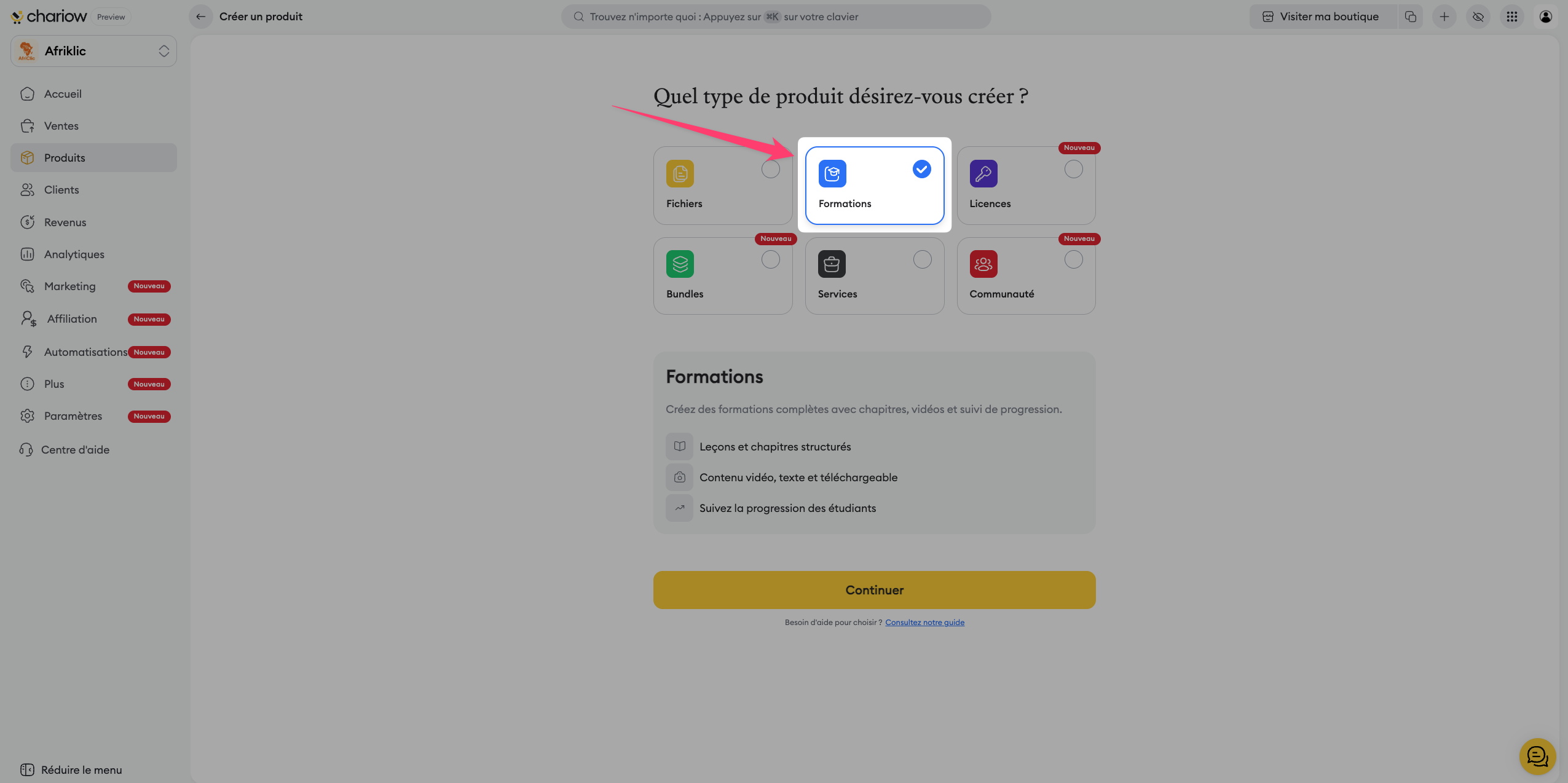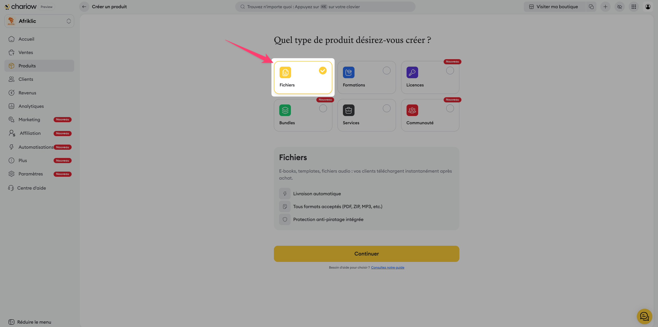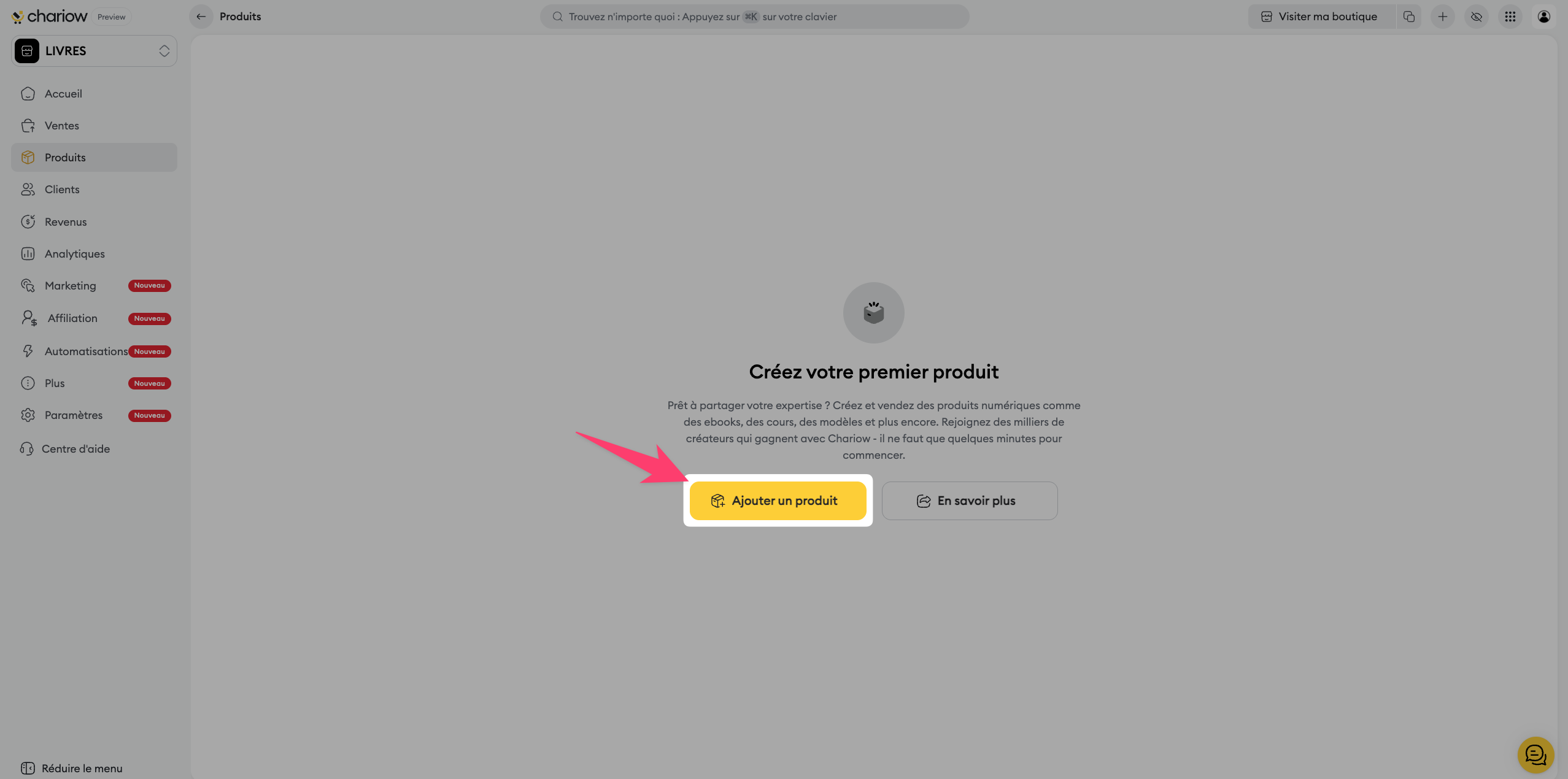 Accédez à l'onglet "Produits" dans votre menu latéral Chariow.