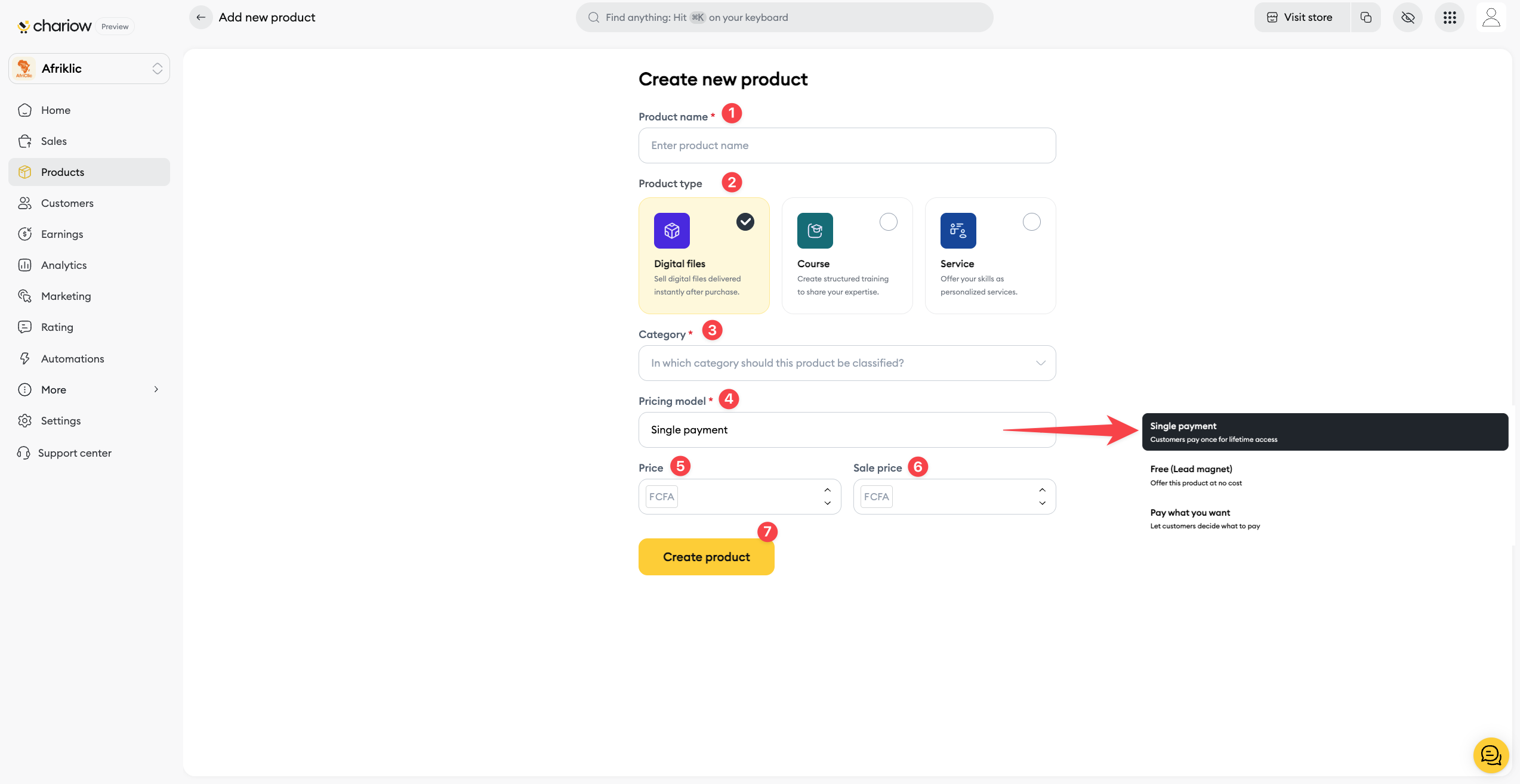 Creating a product on Chariow is a simple and intuitive process. In just a few steps, you can set up your digital product or service and make it available for sale on your store.
