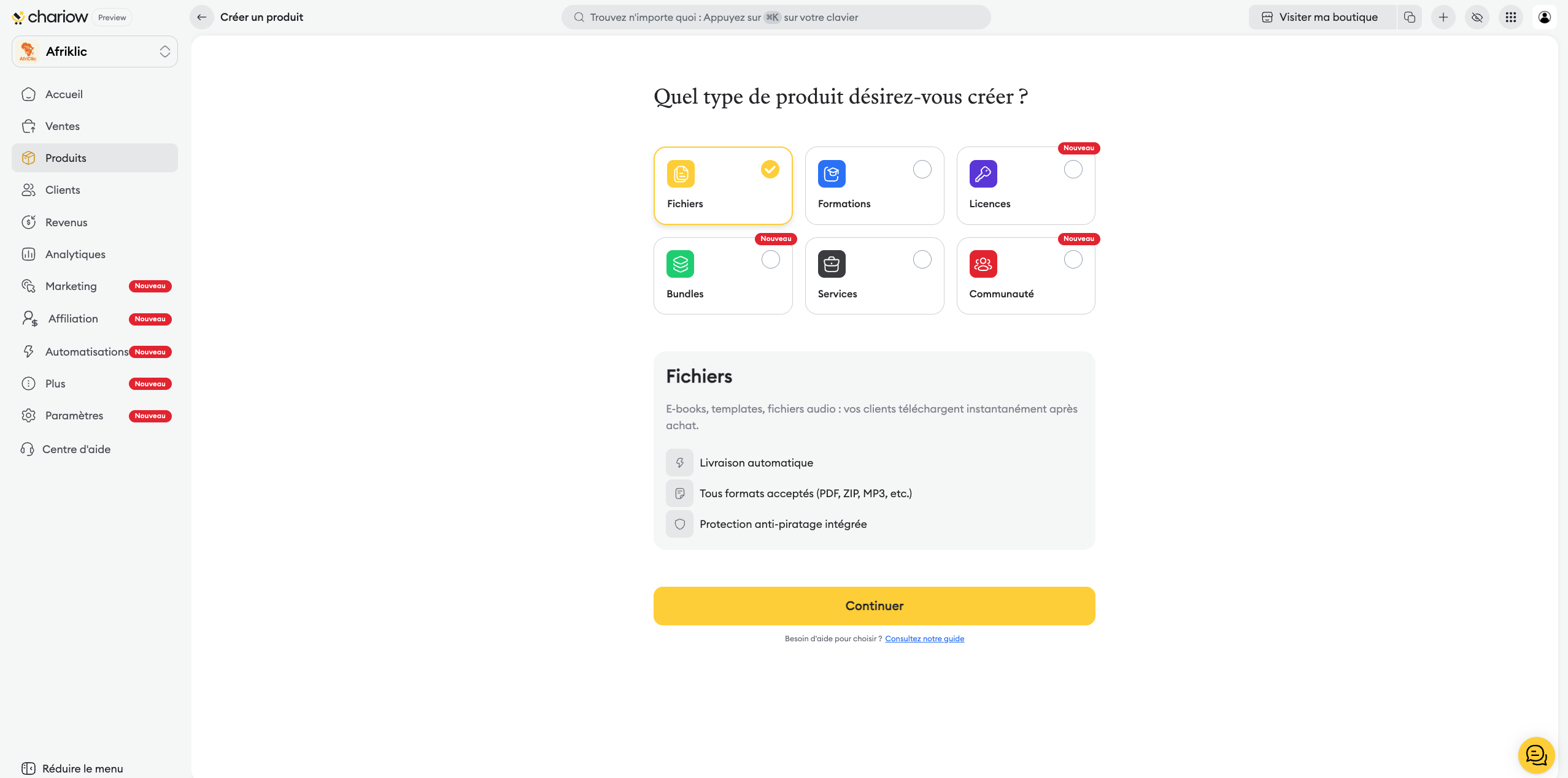 Chariow vous offre la flexibilité de vendre une vaste gamme de produits numériques et de services grâce à une interface de création intuitive. Pour chaque nouvel article, vous disposez d'options de configuration spécifiques afin de répondre parfaitement aux besoins de votre activité.