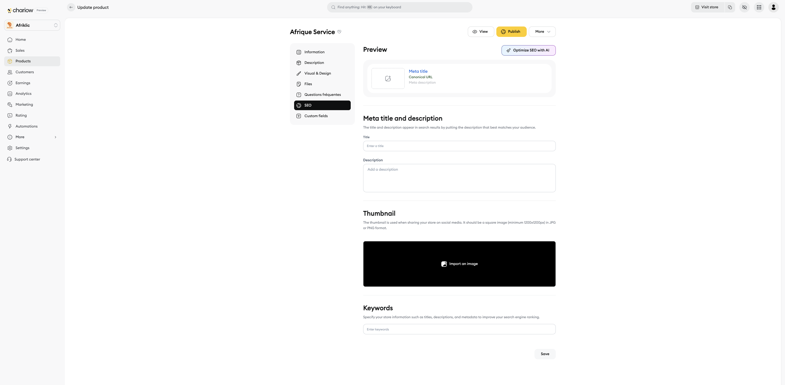 Optimise your Chariow shop's search engine optimisation (SEO)You can create custom fields to collect extra info from your customers (Telegram ID, WhatsApp number, etc.).