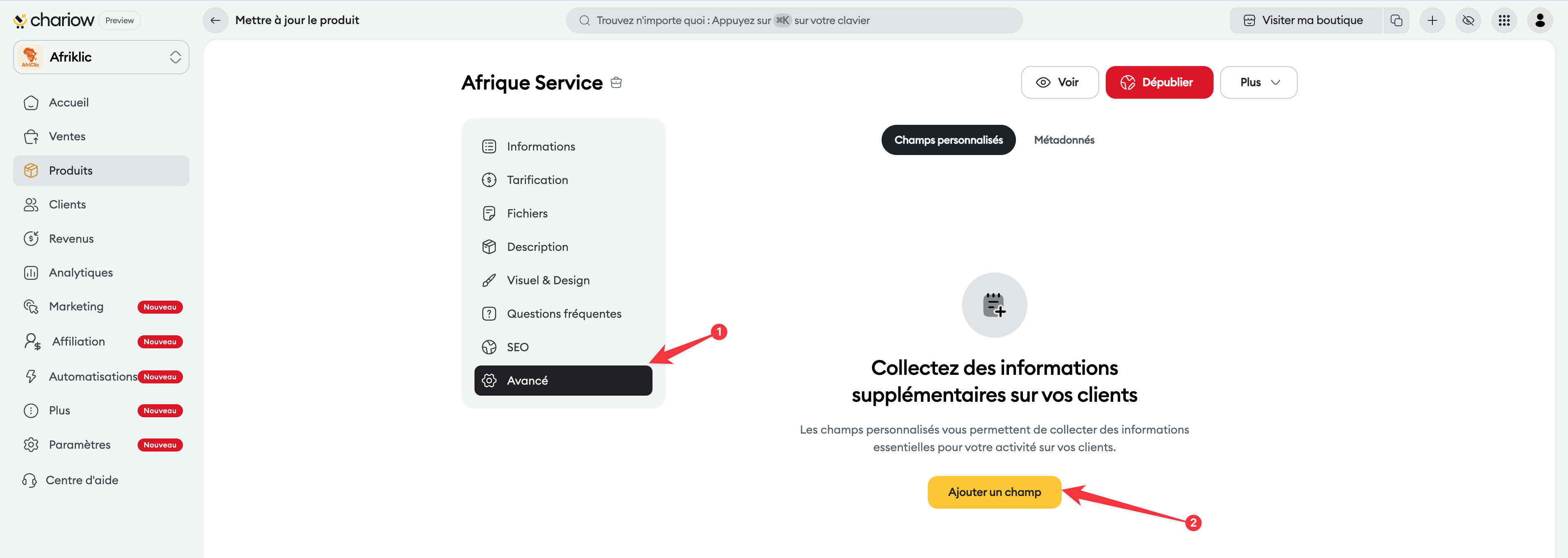 Accès à la configuration : Sur la page de modification de votre produit, cliquez sur l'onglet Avancé dans le menu latéral gauche.