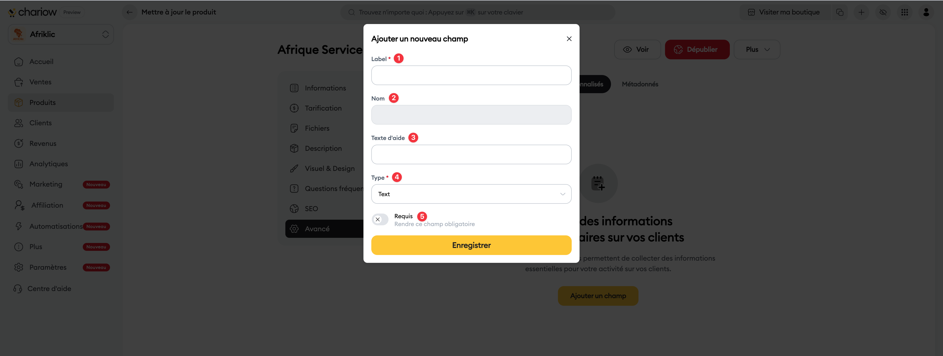 Requis (5) : Activez cet interrupteur si l'information est indispensable pour finaliser la commande.