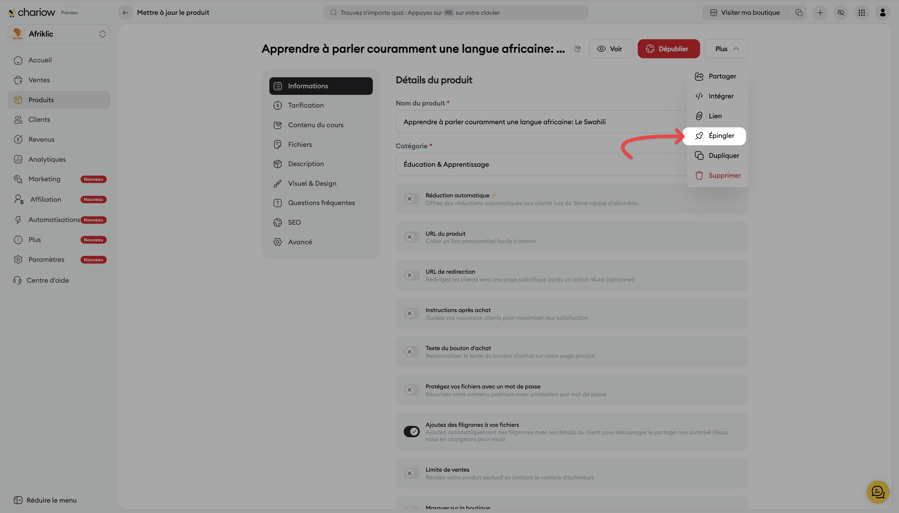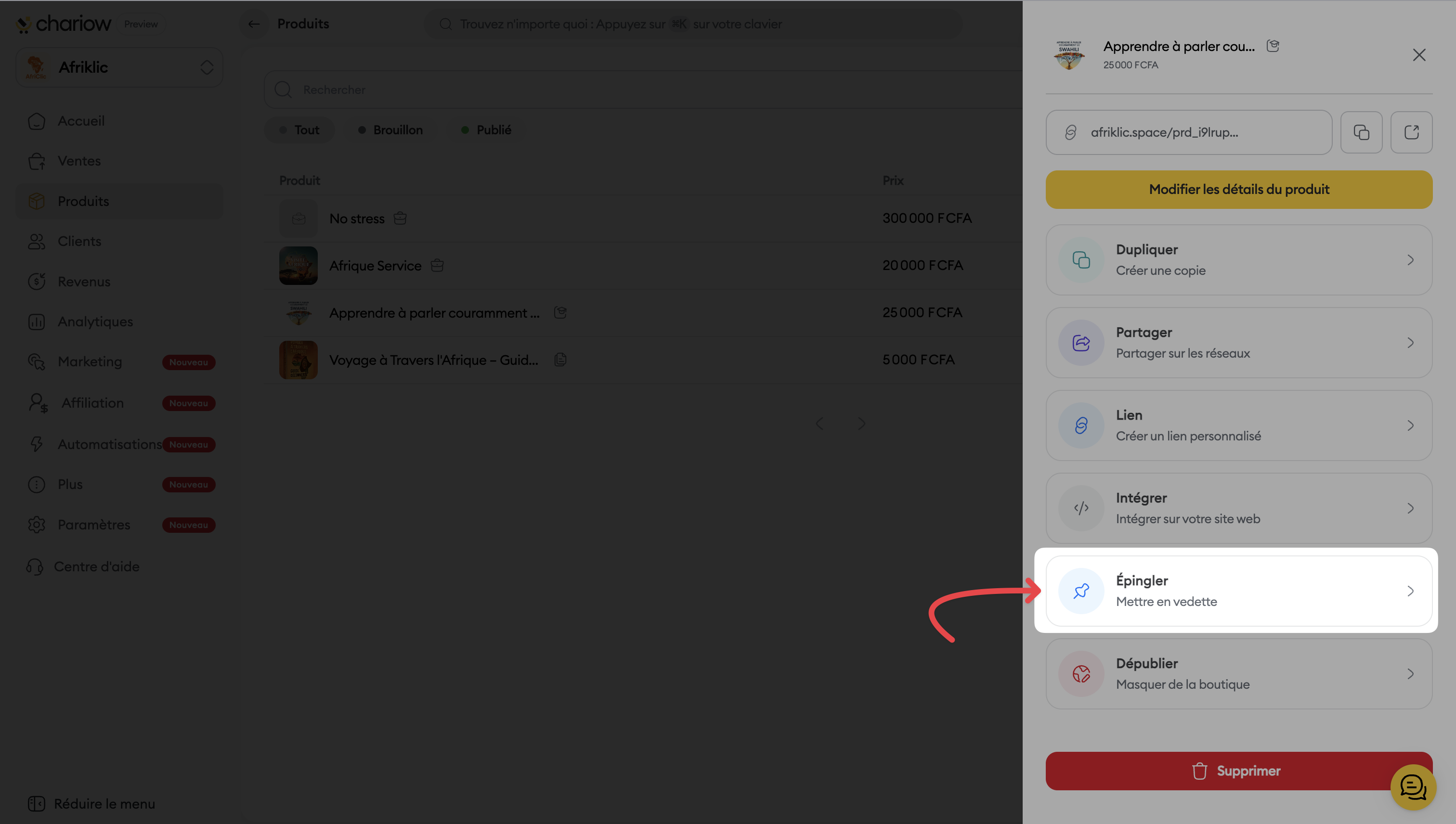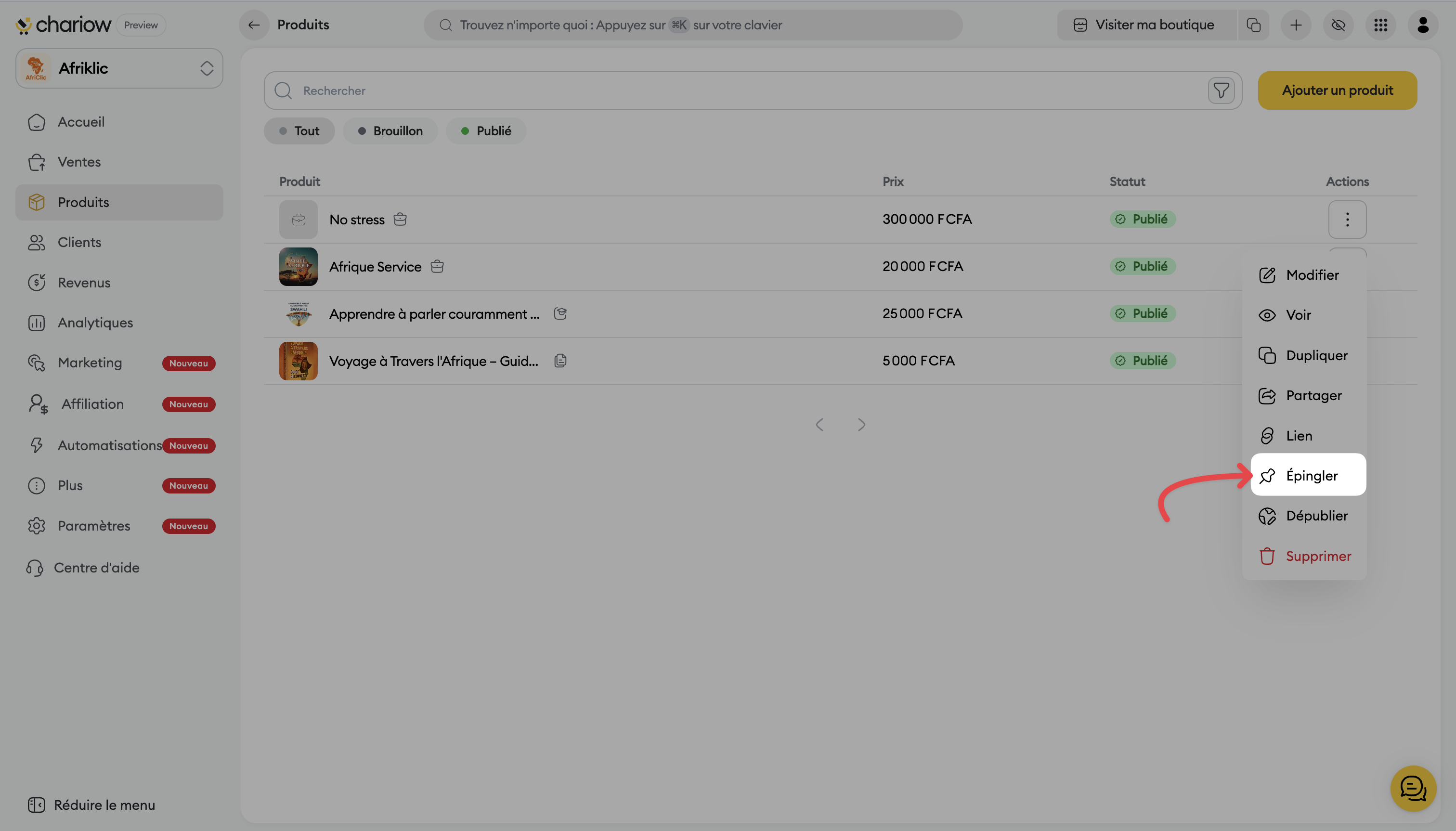 Pour mettre en avant vos produits les plus populaires ou les plus récents, Chariow vous permet de les "épingler" en haut de votre boutique. Un produit épinglé reste visible en première position, peu importe le nombre de nouveaux produits ajoutés. De la même manière, vous pouvez le "désépingler" pour qu'il reprenne sa place dans l'ordre chronologique de publication.