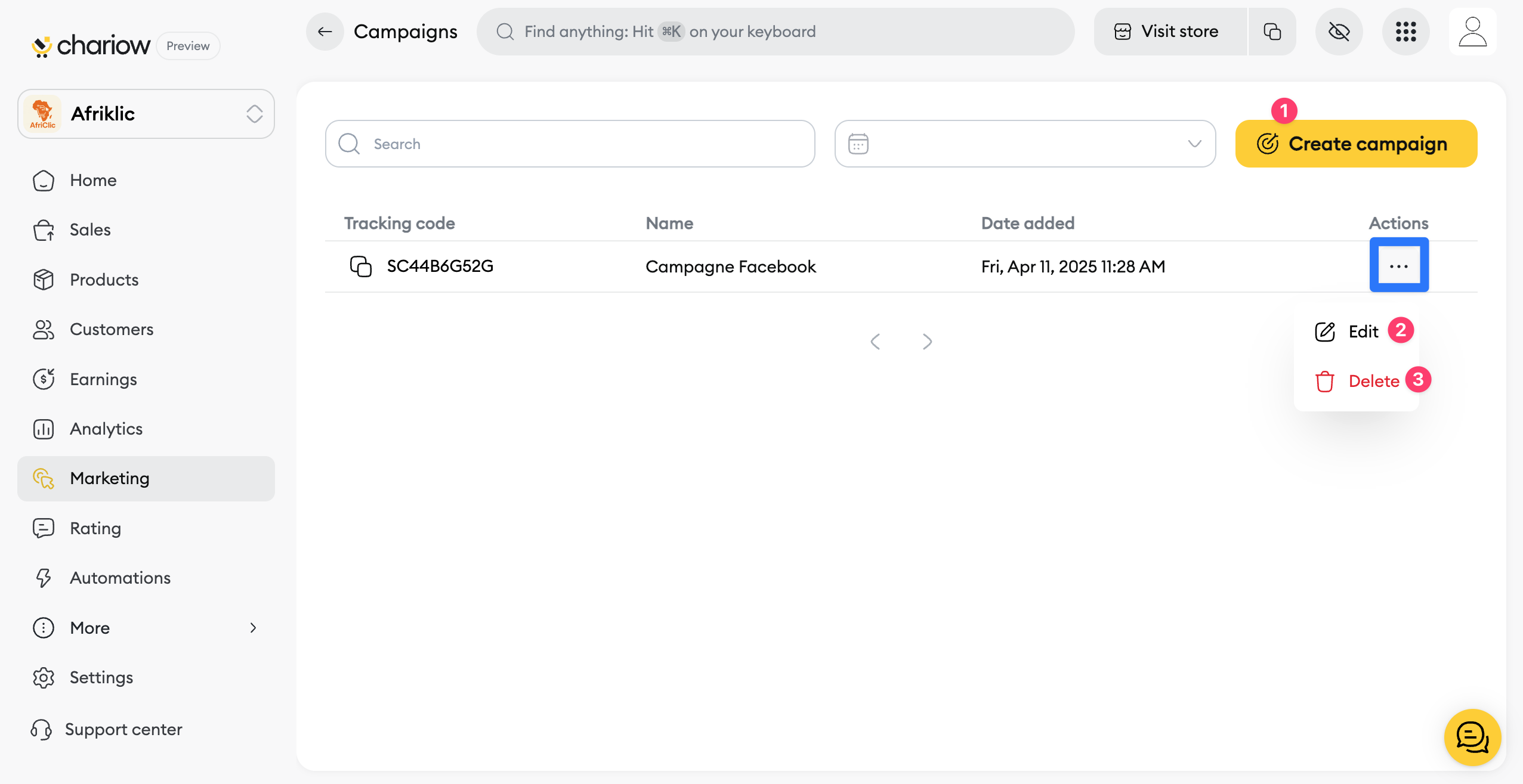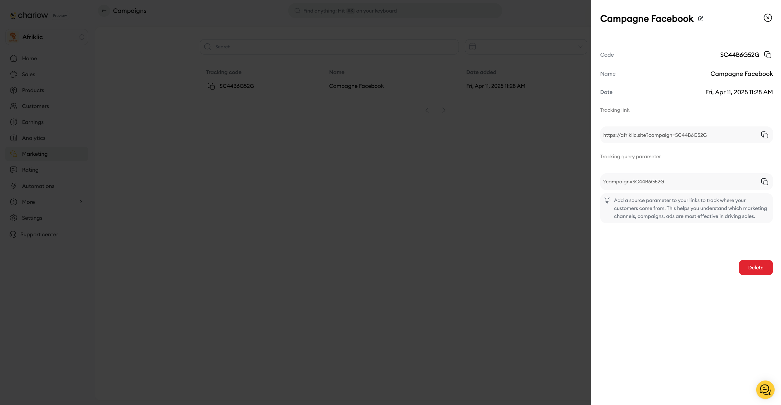 The Campaigns section of your Chariow dashboard has a specific purpose: to allow you to measure the effectiveness of your promotional activities. By generating a tracking code associated with your URL, you can identify the origin of your customers and optimize your efforts.