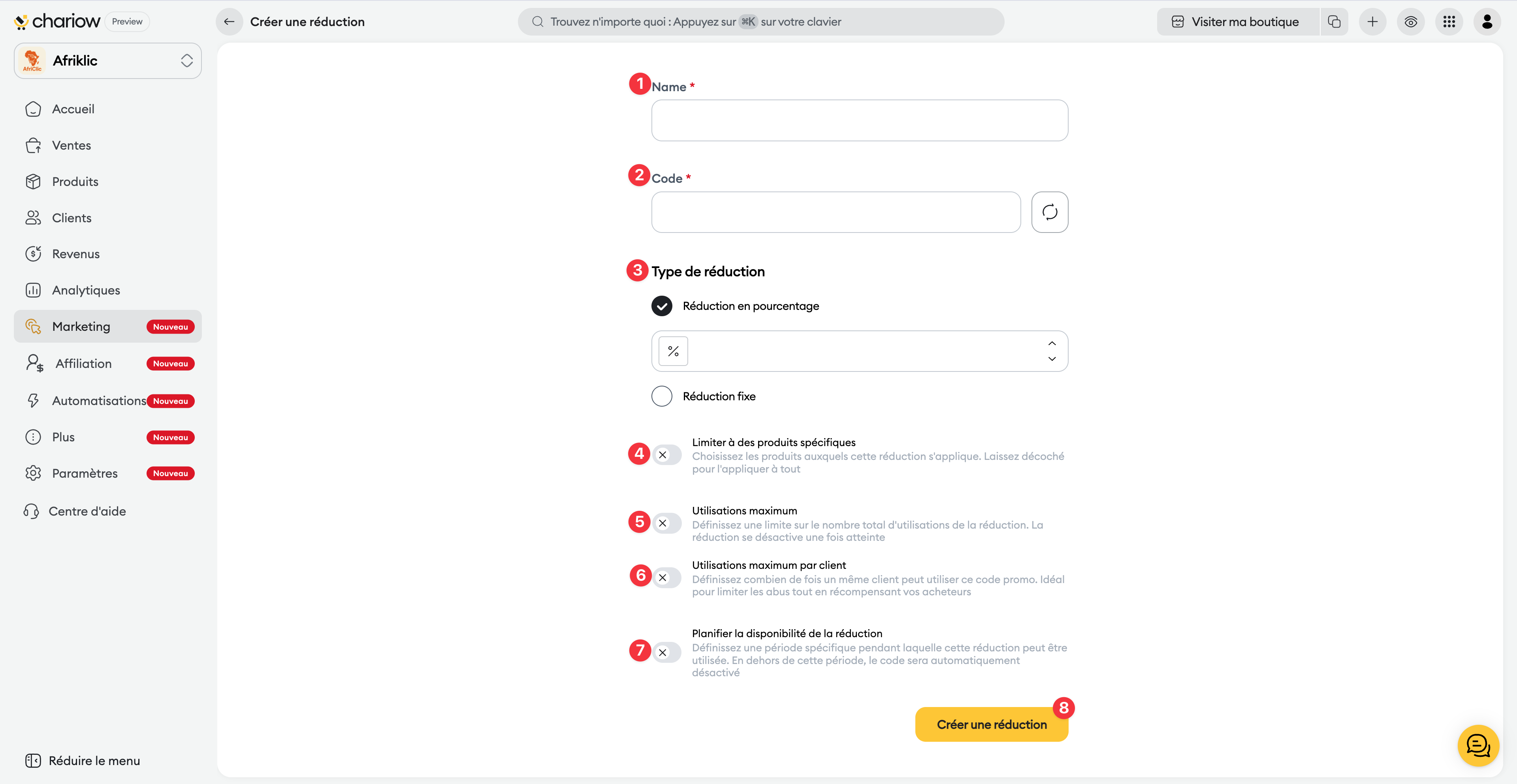 Pour mettre en place votre code promo, rendez-vous sur votre tableau de bord Chariow et cliquez sur Marketing dans le menu de gauche. Ensuite, sélectionnez Réductions puis cliquez sur le bouton Créer une réduction.