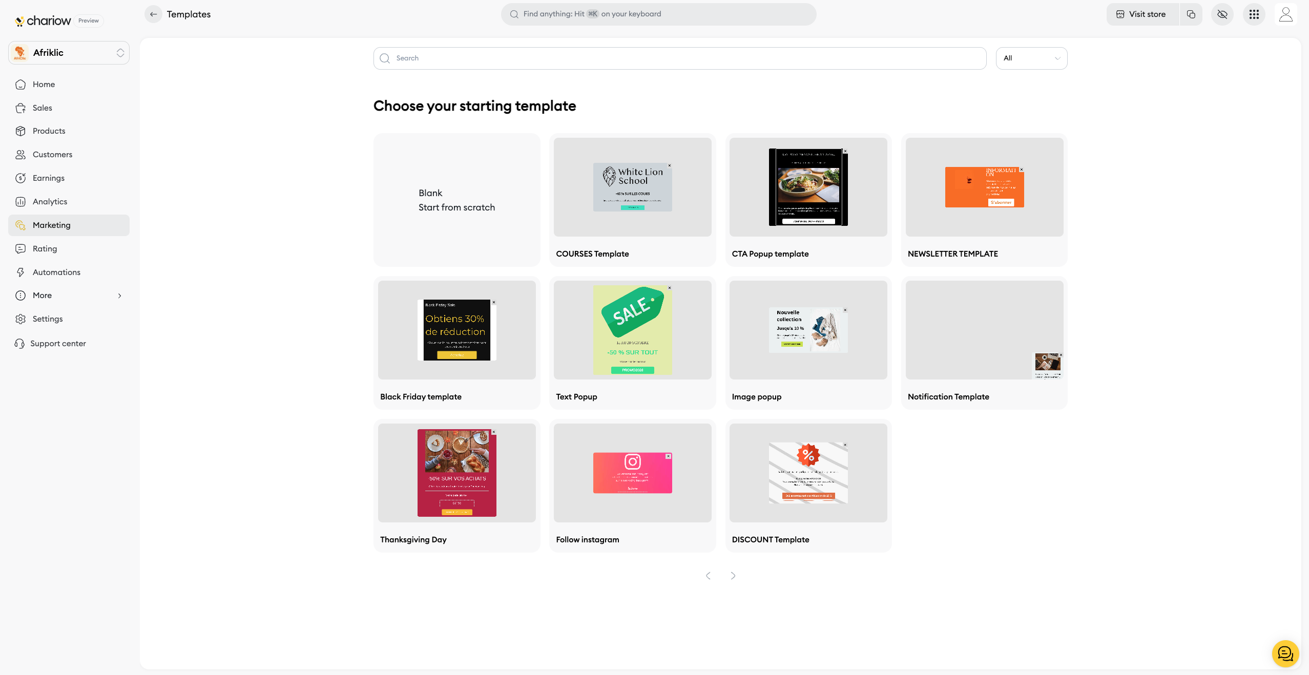 To begin, go to the Marketing section of your Chariow dashboard and click the Create a Popup button.