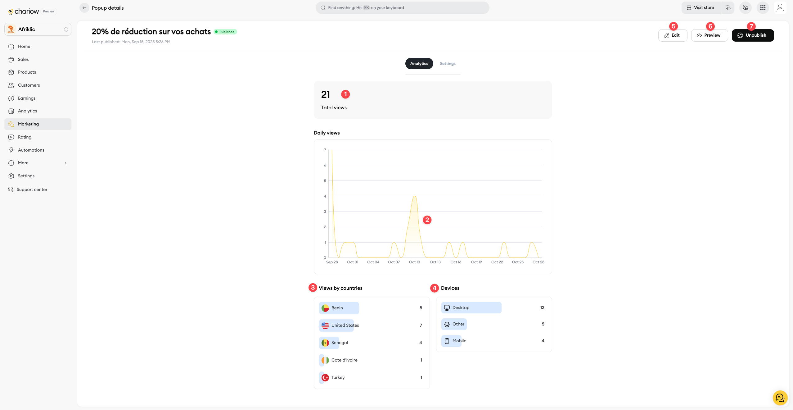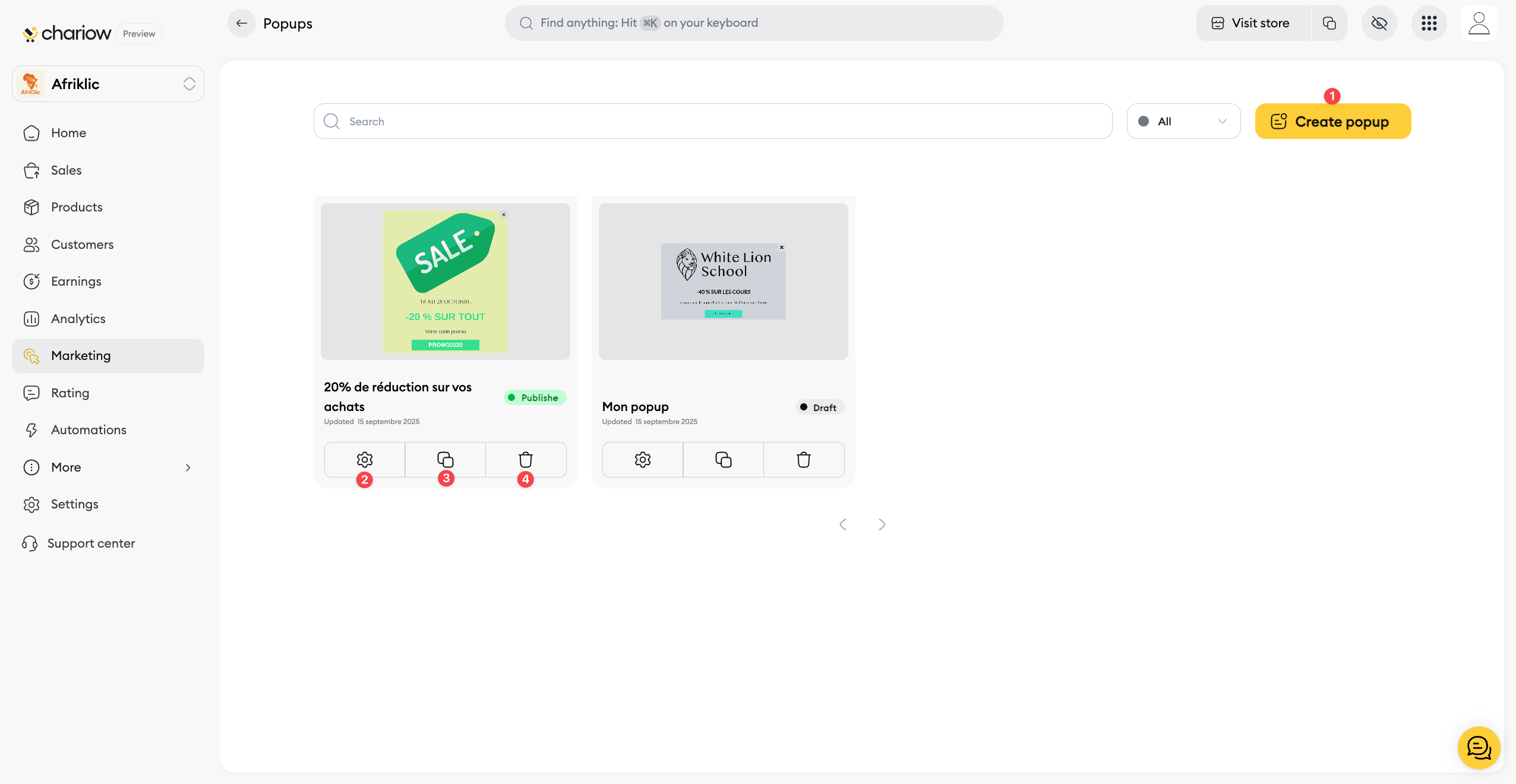 Being able to edit an existing popup without having to start from scratch every time and track its performance is key to tweaking your marketing game. The Popup section of your Chariow dashboard was made to give you total control over the look, content, and behavior of your popups.
