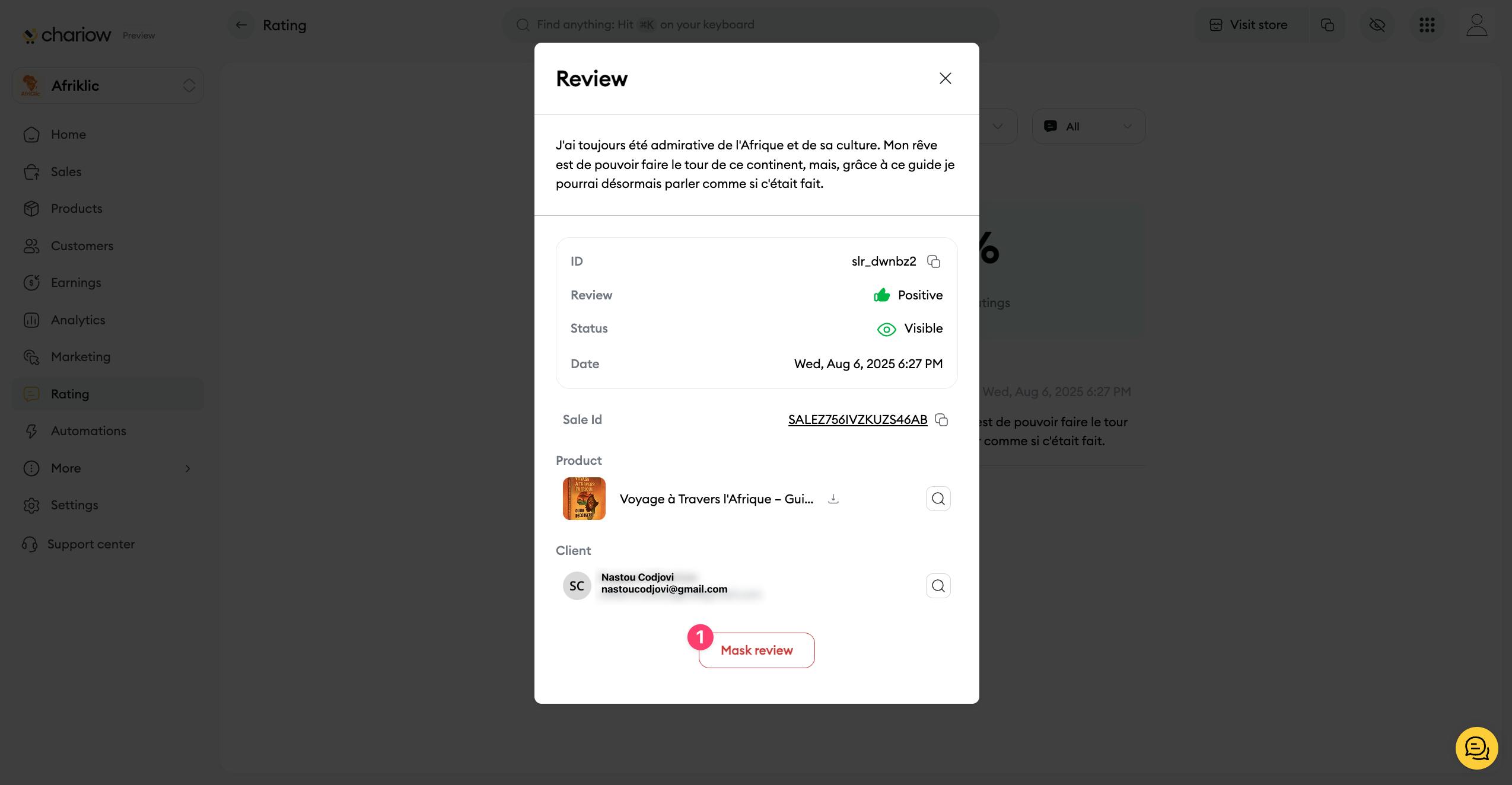 Managing customer reviews is crucial for your store's image. Chariow allows you to hide inappropriate or irrelevant reviews, which is essential for maintaining a professional and credible online presence.