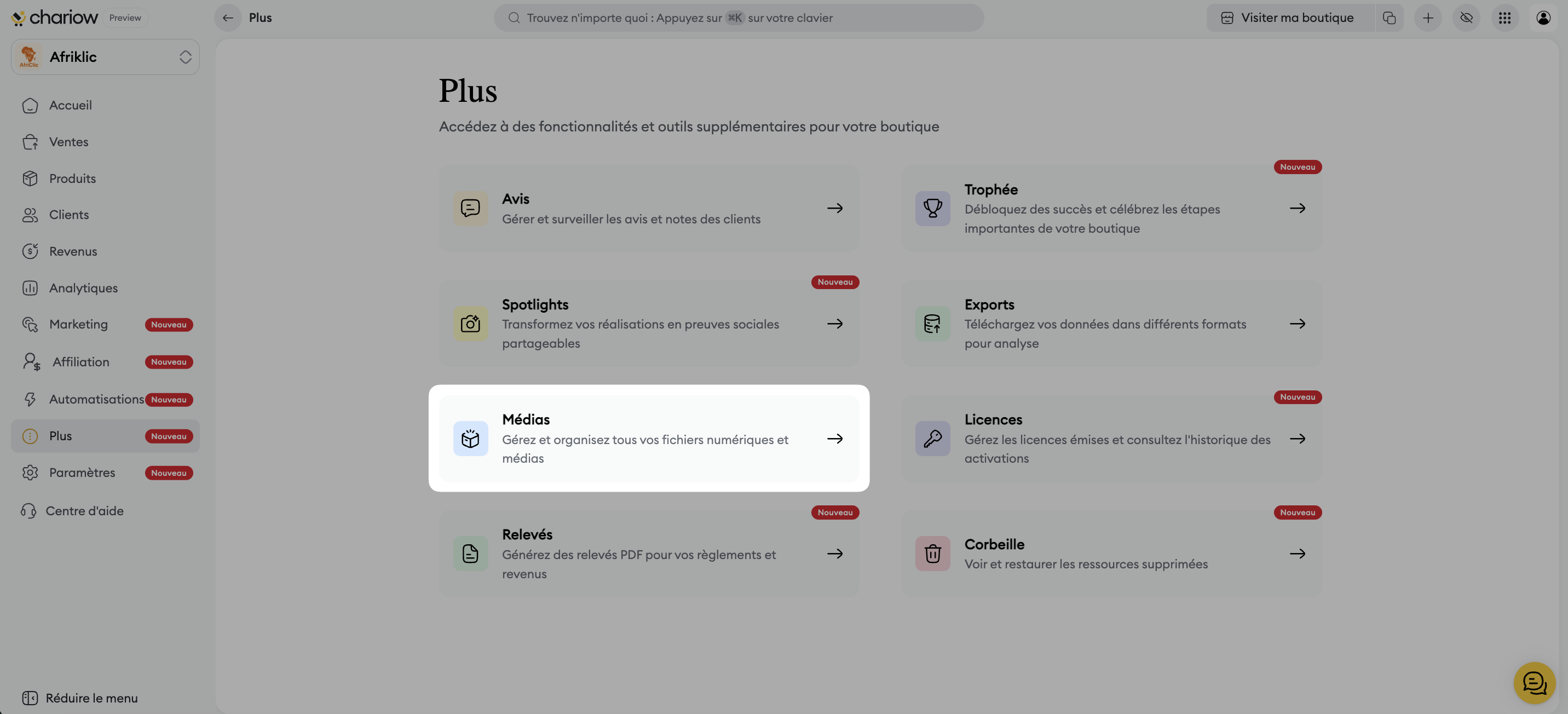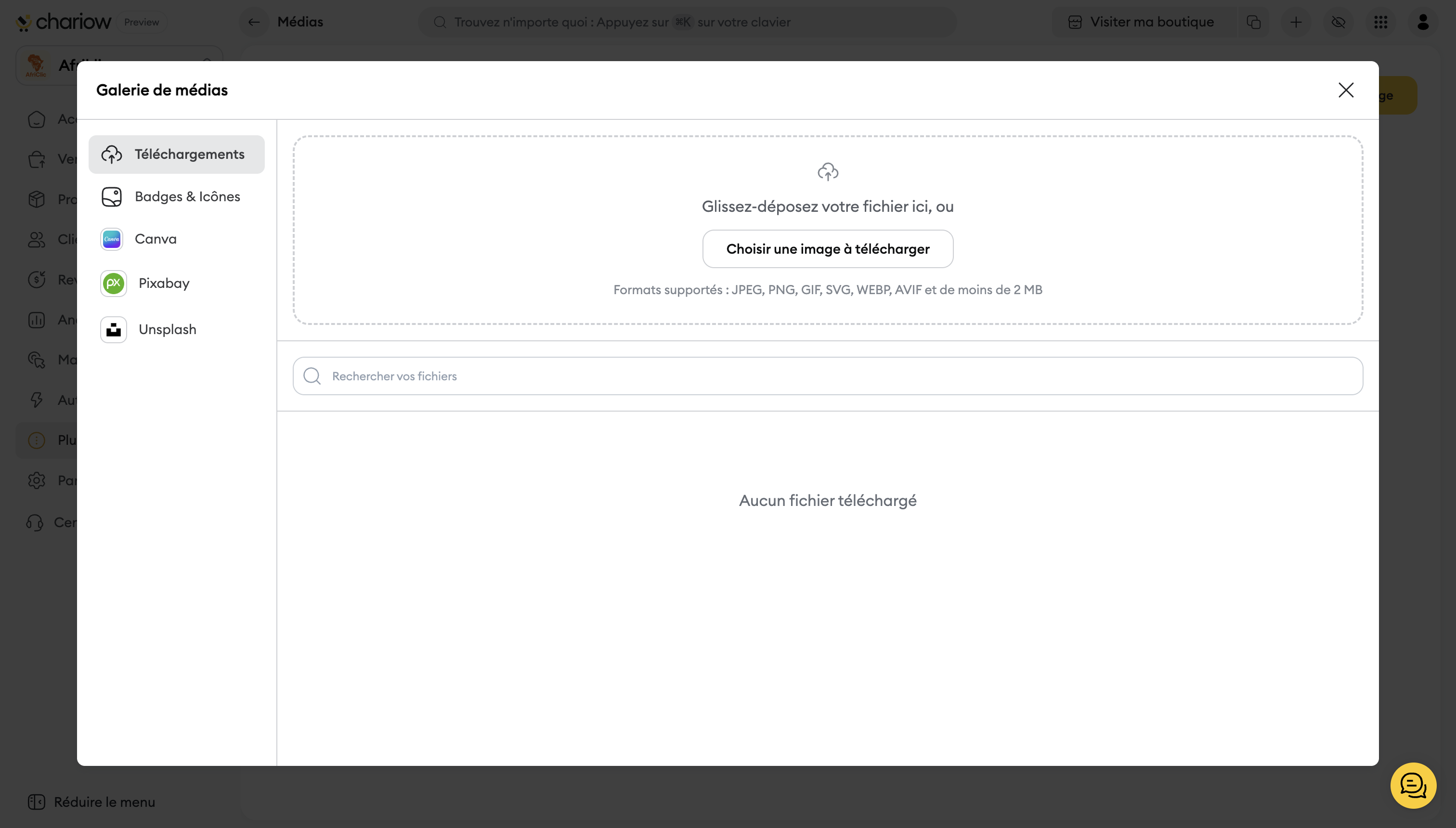 La section Médias de votre tableau de bord Chariow est votre bibliothèque d'images. Vous pouvez y ajouter toutes les images de votre marque pour les retrouver et les utiliser facilement lorsque vous créez vos produits, popups et autres contenus marketing.