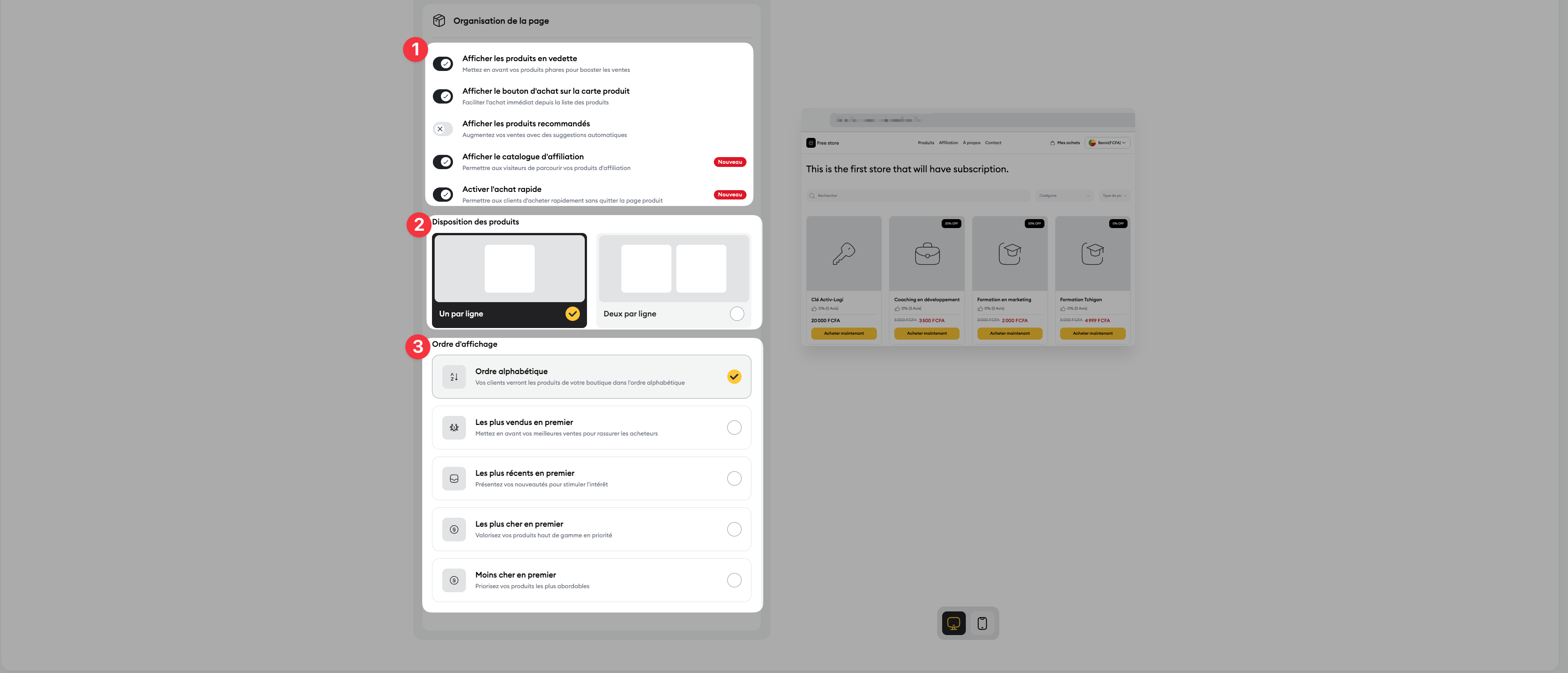 C'est ici que vous structurez l'affichage de vos produits et les fonctionnalités d'achat :
