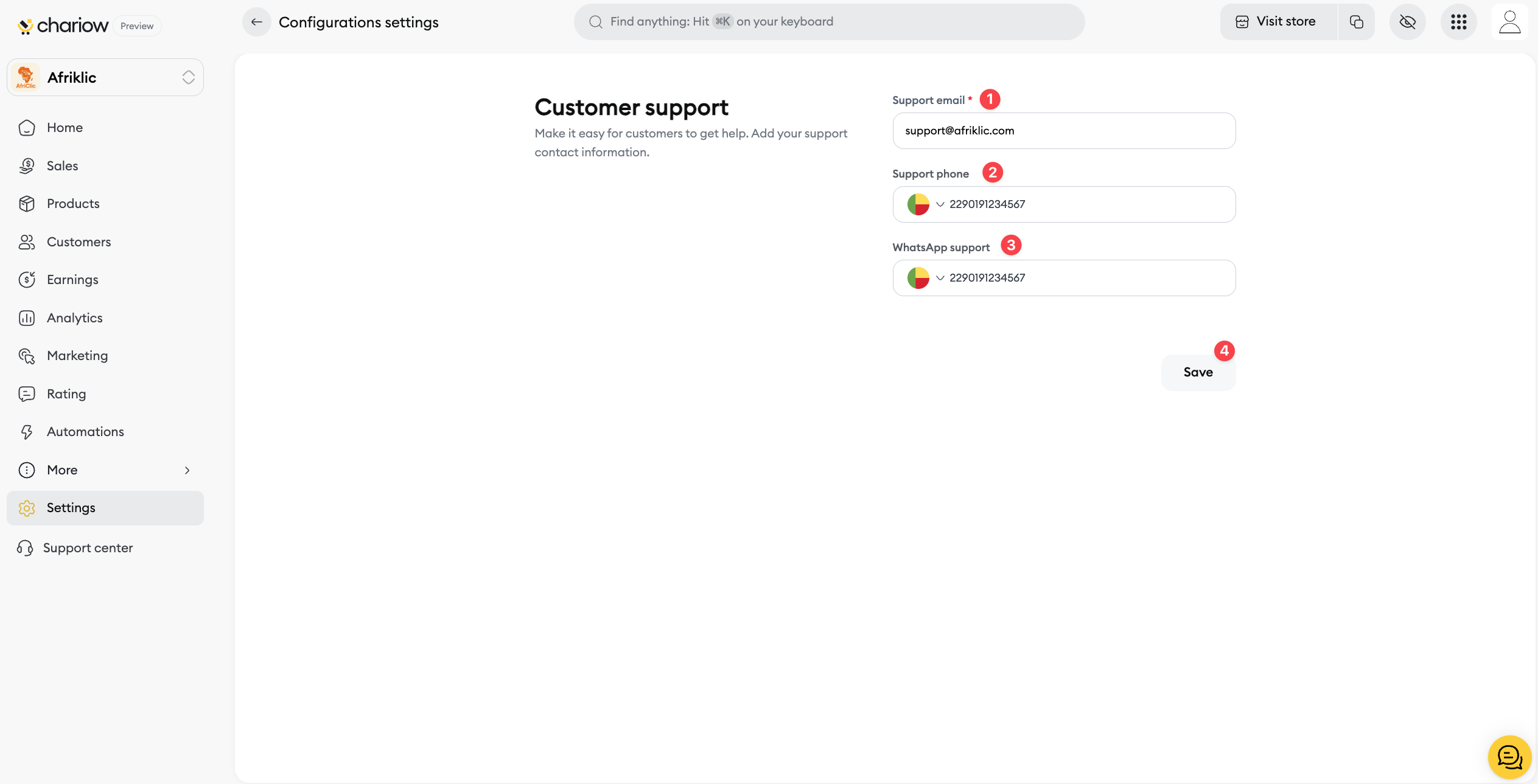 Once you’ve filled in all the contacts you want, click the Save (4) button to update the info on your store.