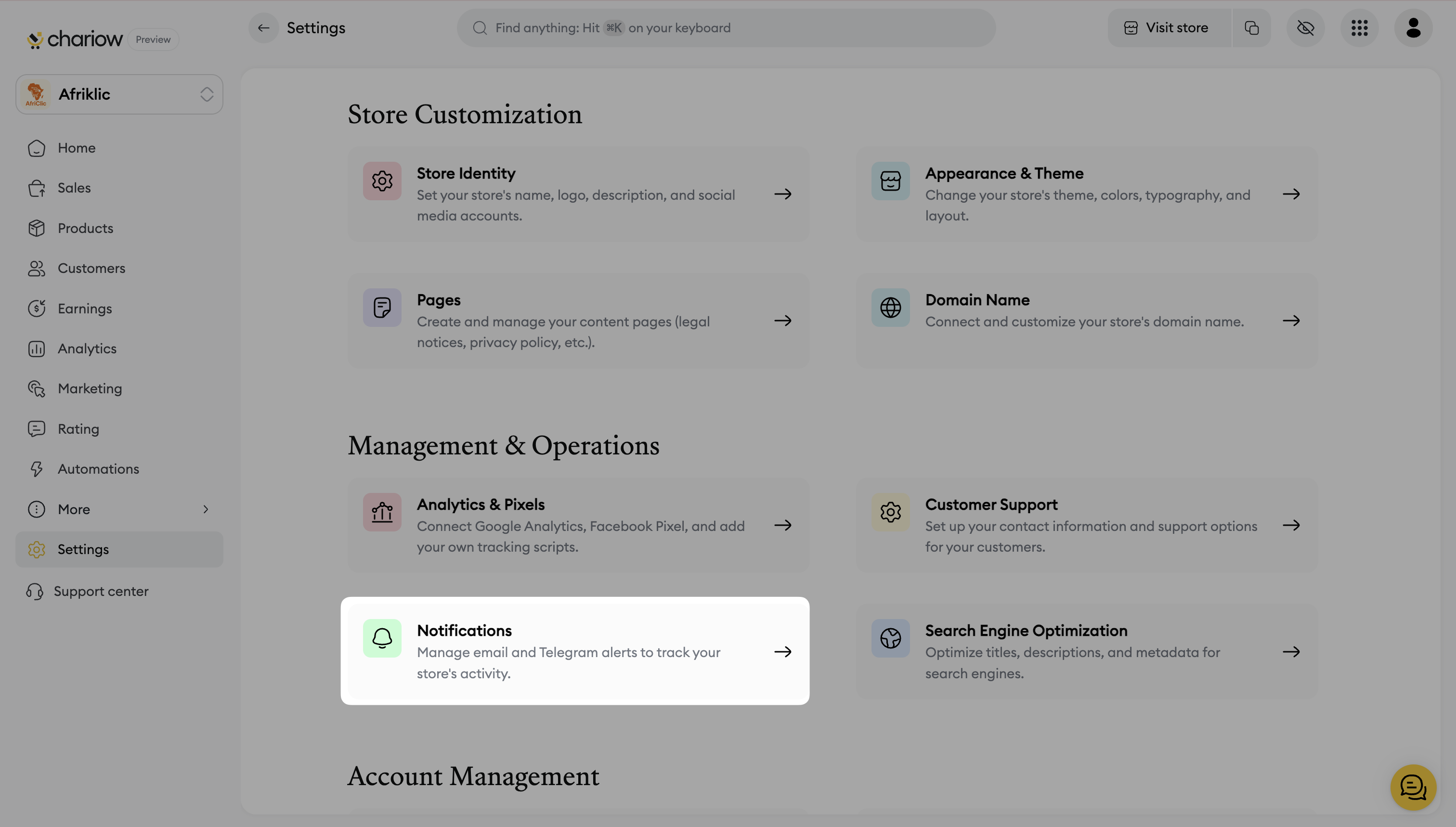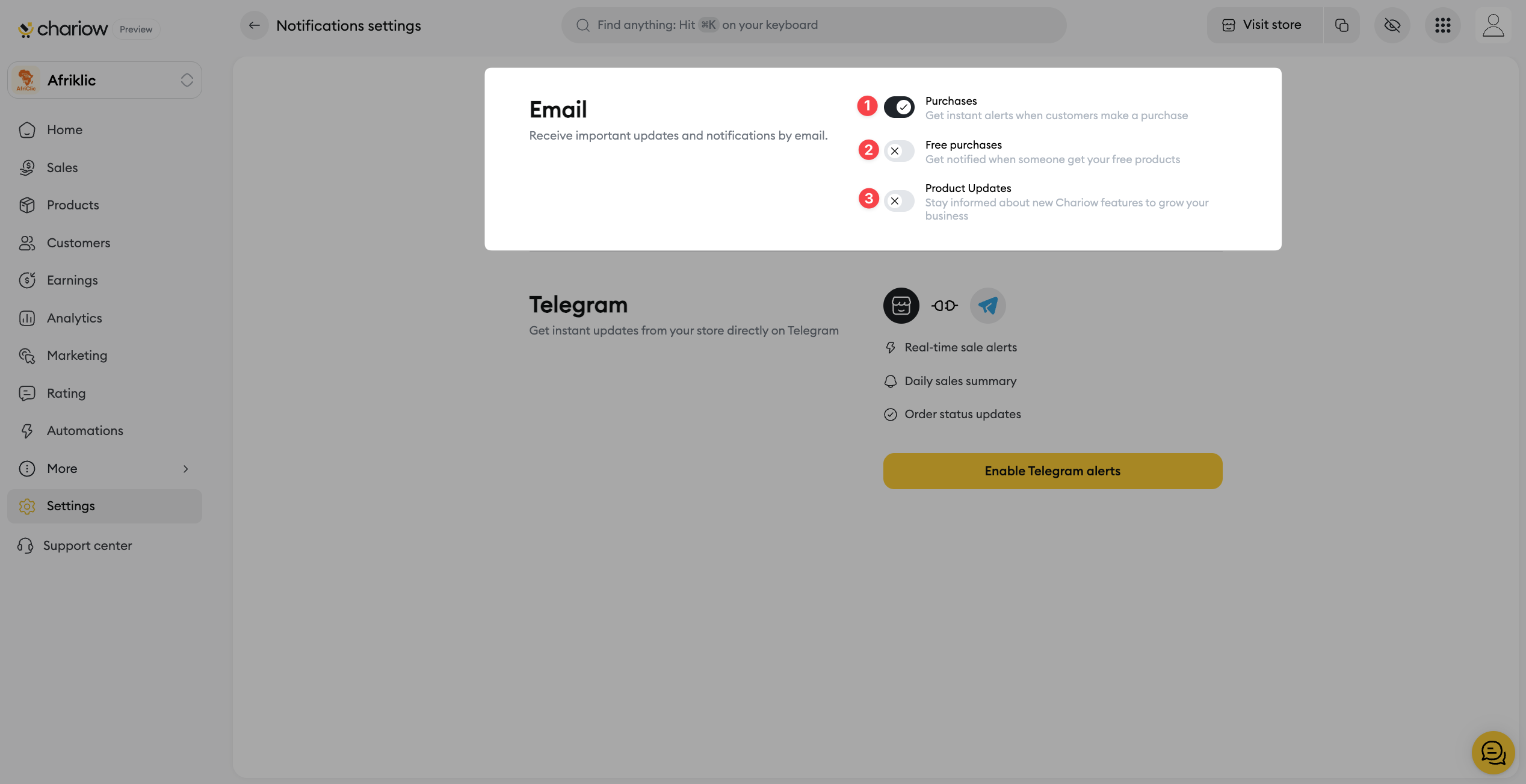 Product news (3): Turn this option on to get updates about new features from Chariow.