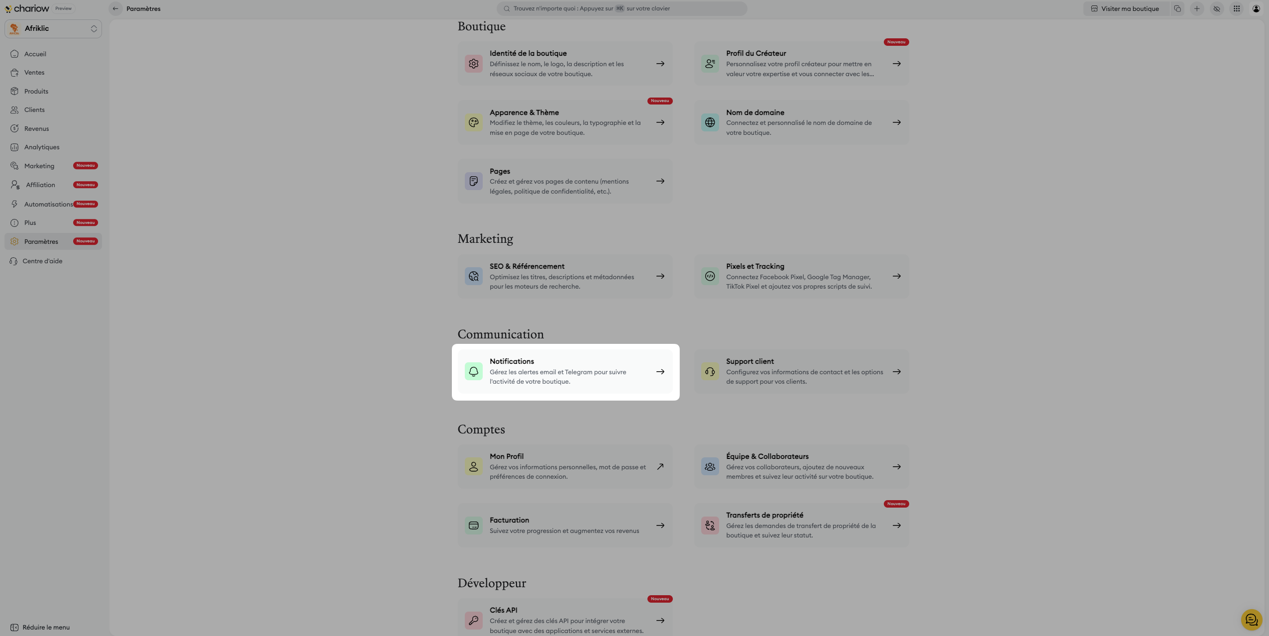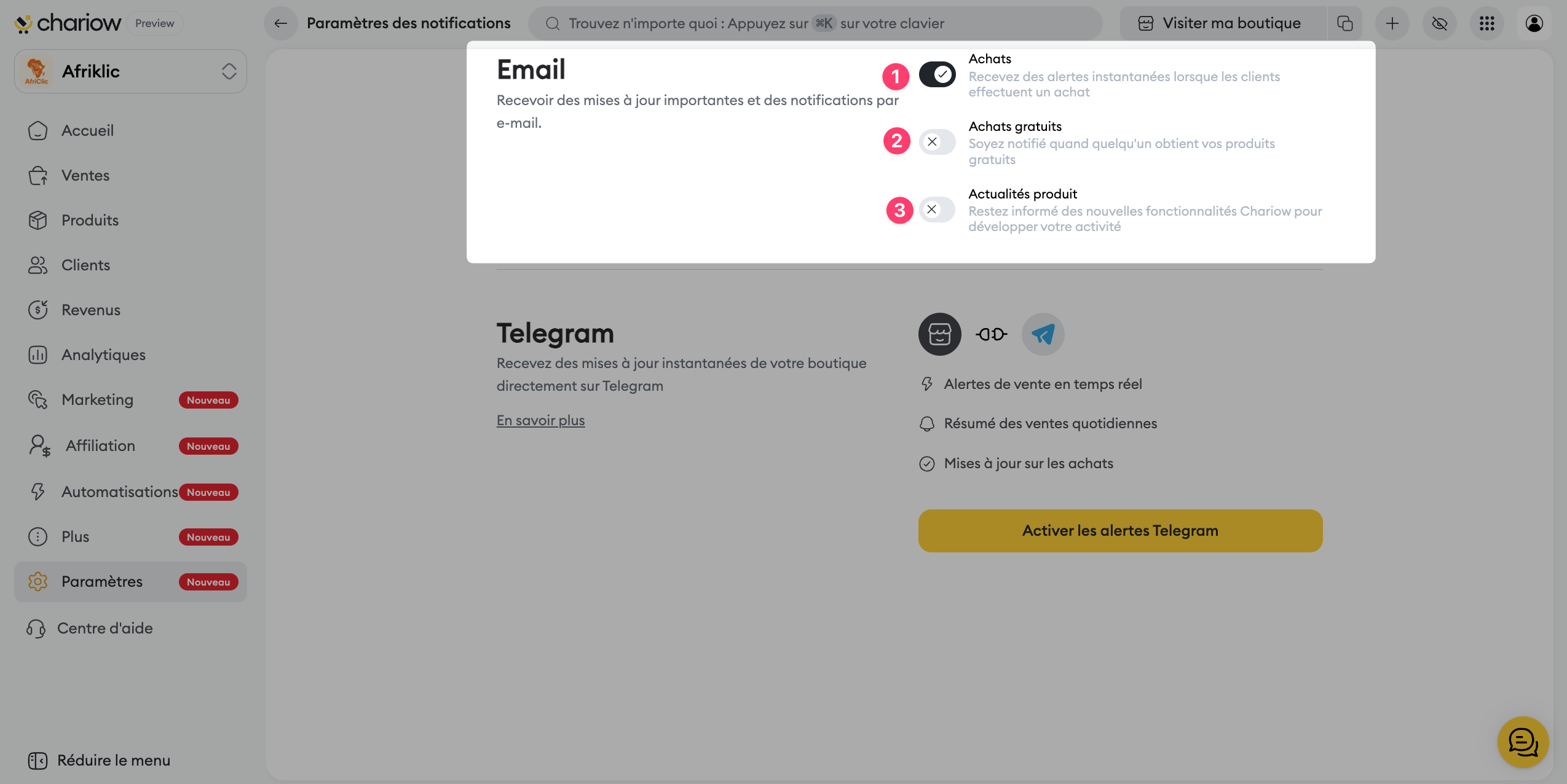 Actualités produit (3) : Activez cette option pour recevoir des informations sur les nouvelles fonctionnalités de Chariow.