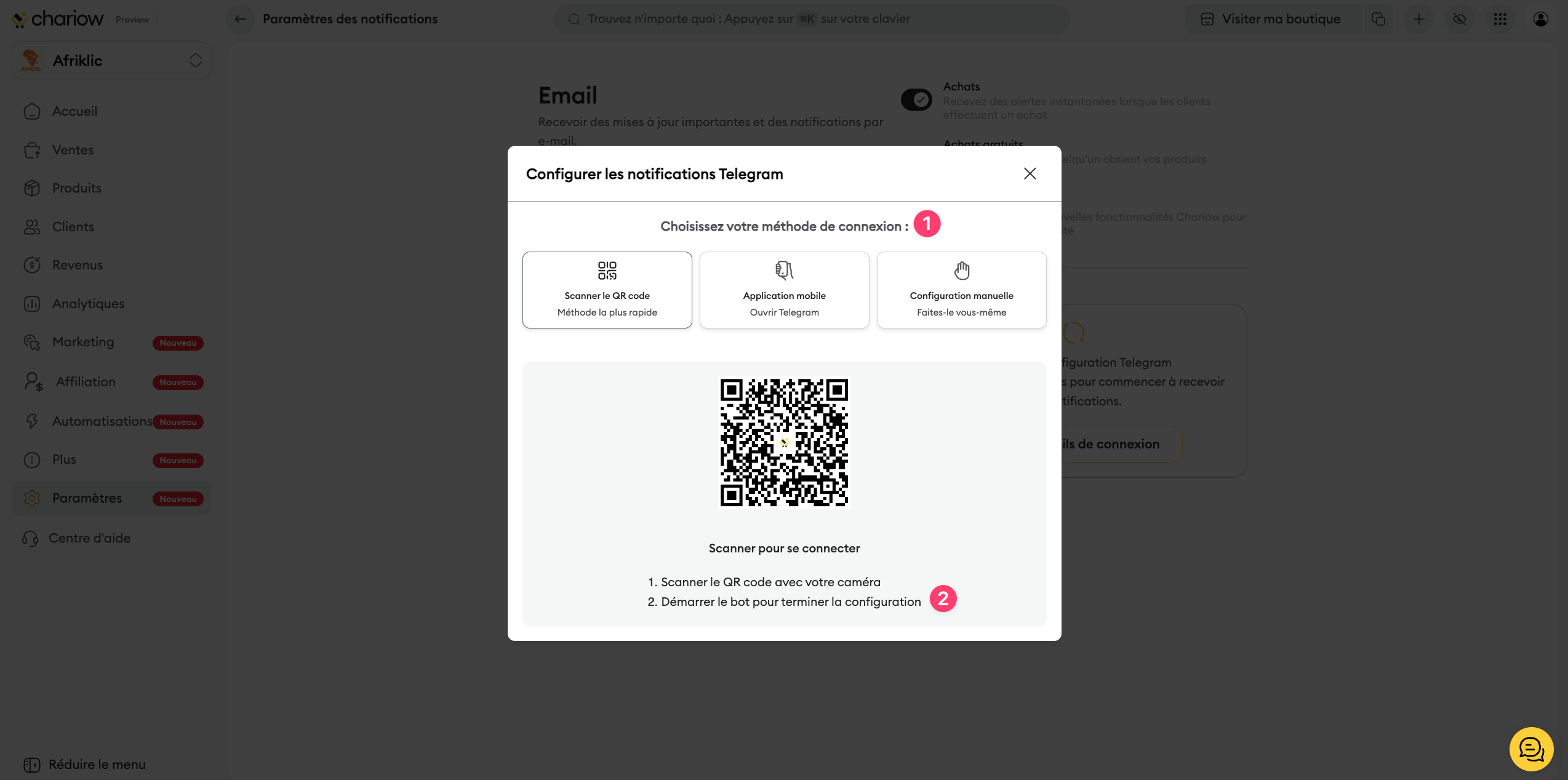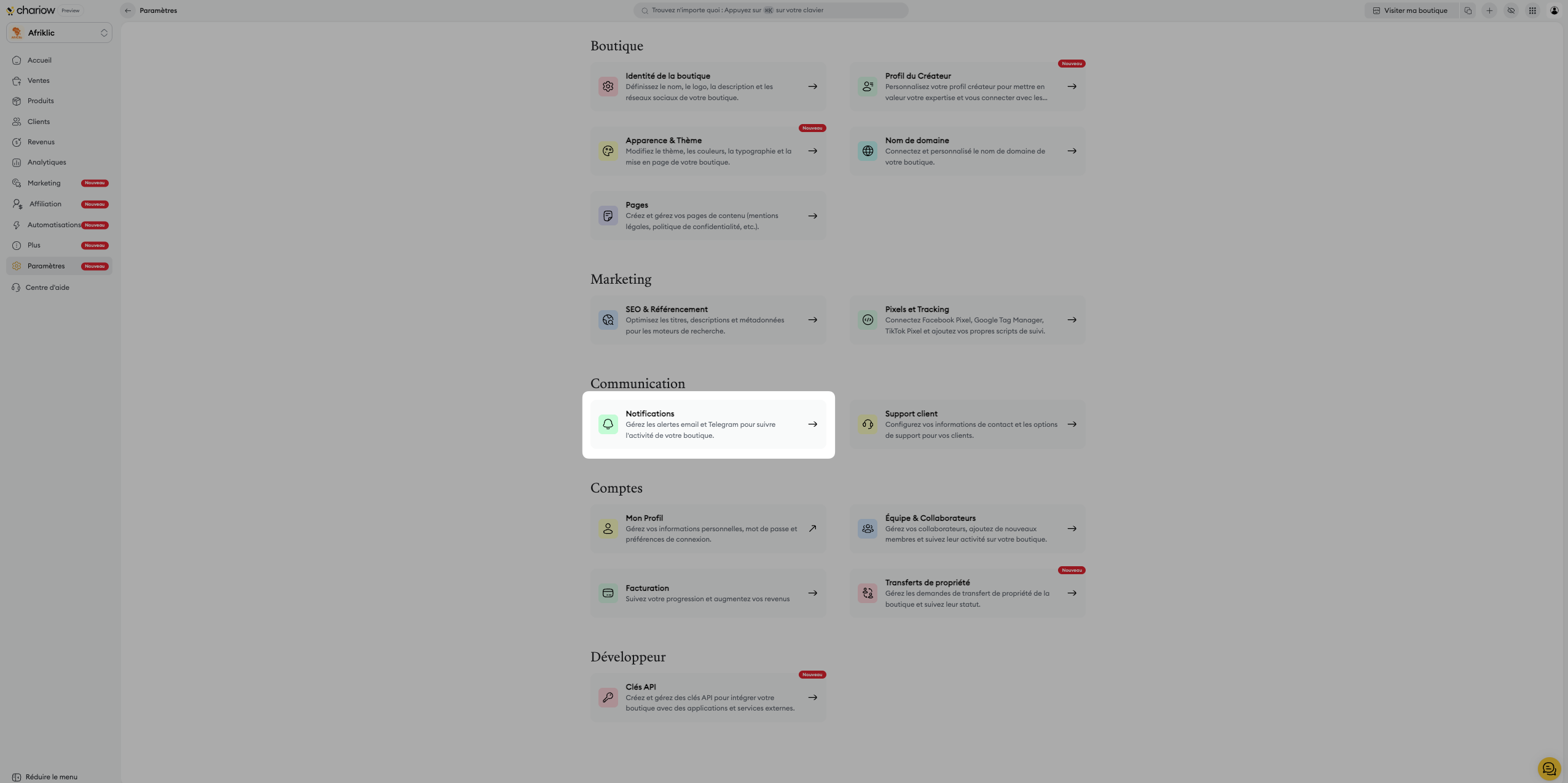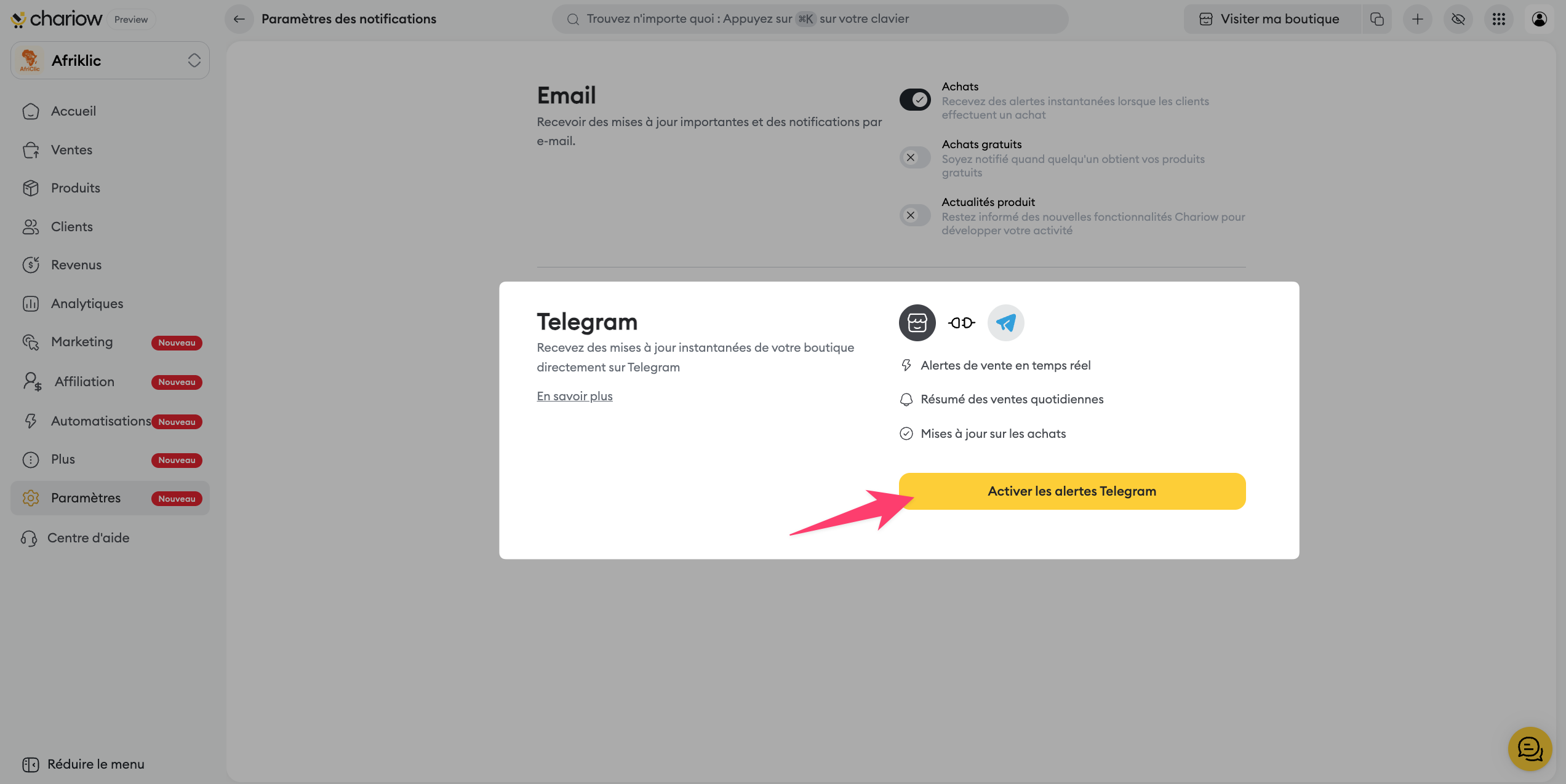 Le bot Telegram de Chariow vous permet de recevoir des mises à jour instantanées de votre boutique (alertes de vente, résumés quotidiens) directement sur votre téléphone. C'est l'outil idéal pour suivre votre activité en temps réel.