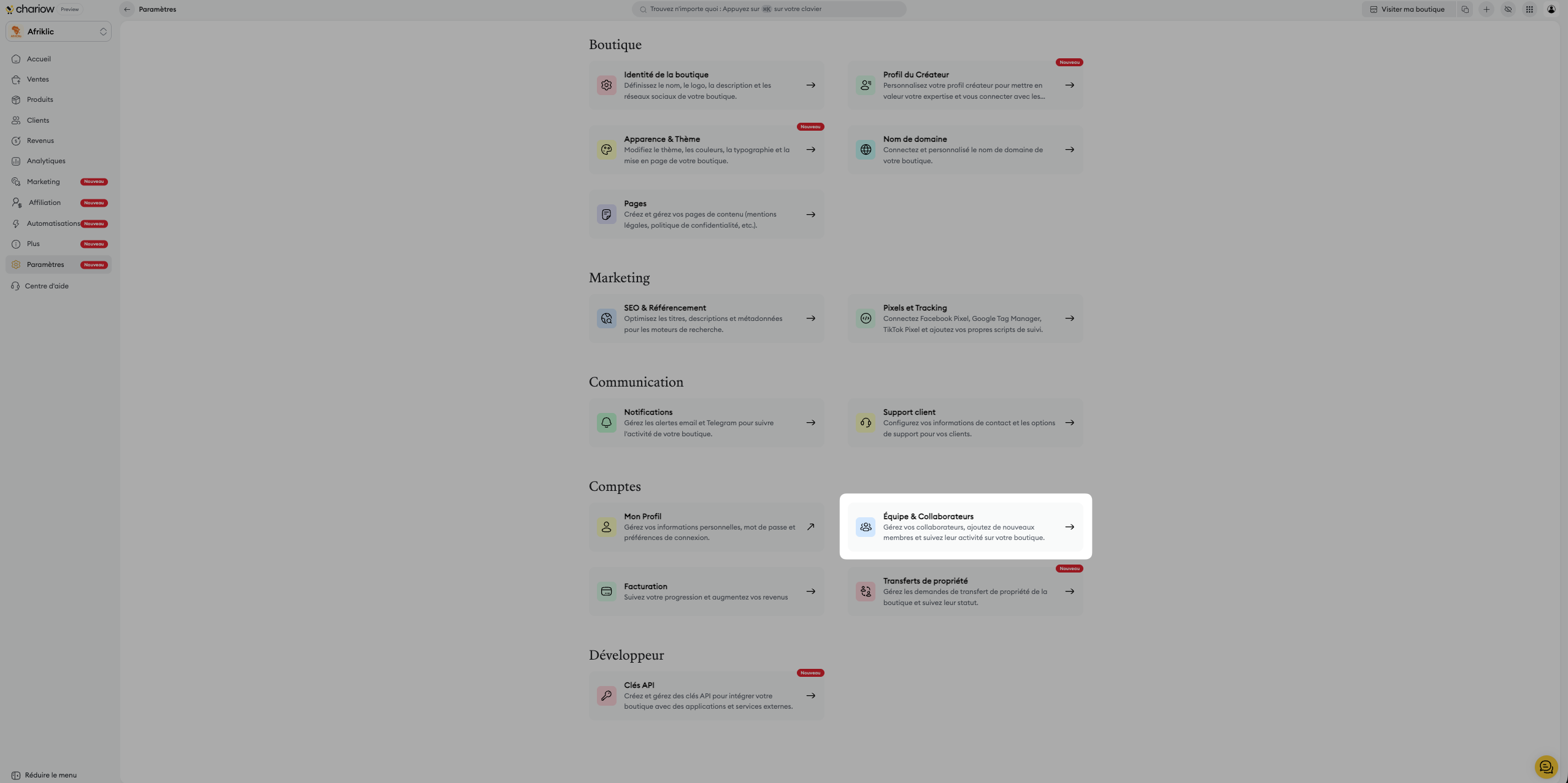 Inviter des collaborateurs à rejoindre votre équipe Chariow vous permet de partager les responsabilités, de déléguer des tâches et d'accélérer le développement de votre boutique. Vous contrôlez les accès et les permissions de chaque membre pour une sécurité optimale.
