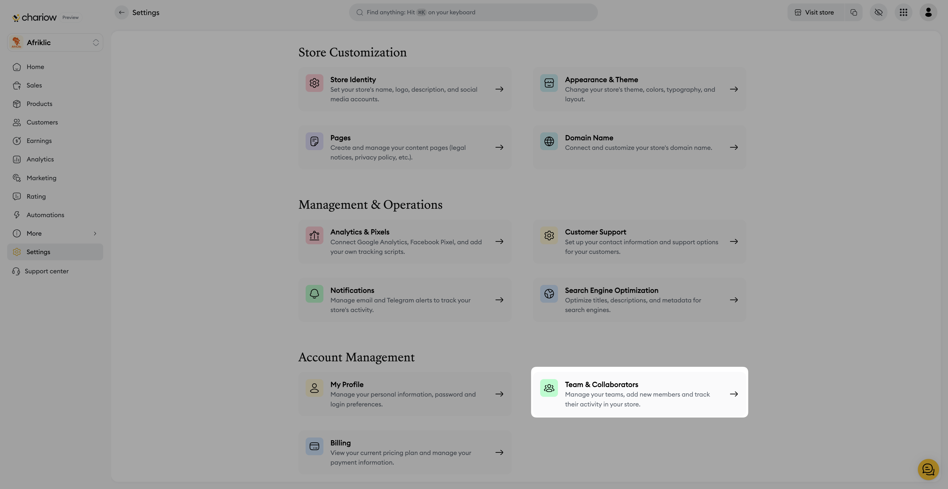 Inviting collaborators to join your Chariow team lets you share responsibilities, delegate tasks, and speed up the growth of your store. You control access and permissions for each member for top-notch security.