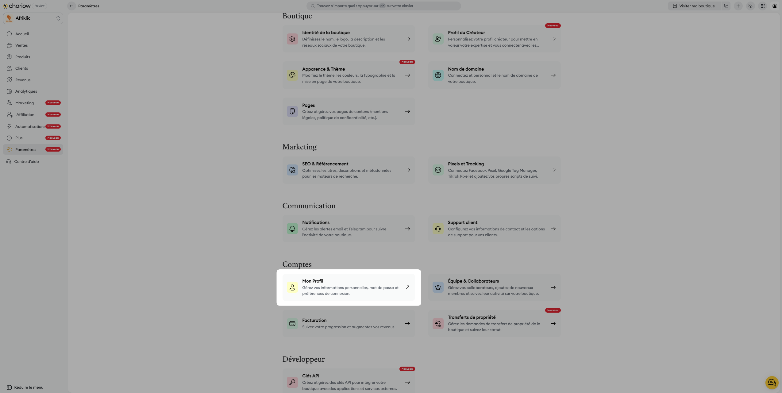 Depuis votre tableau de bord Chariow, allez dans Paramètres (Settings).