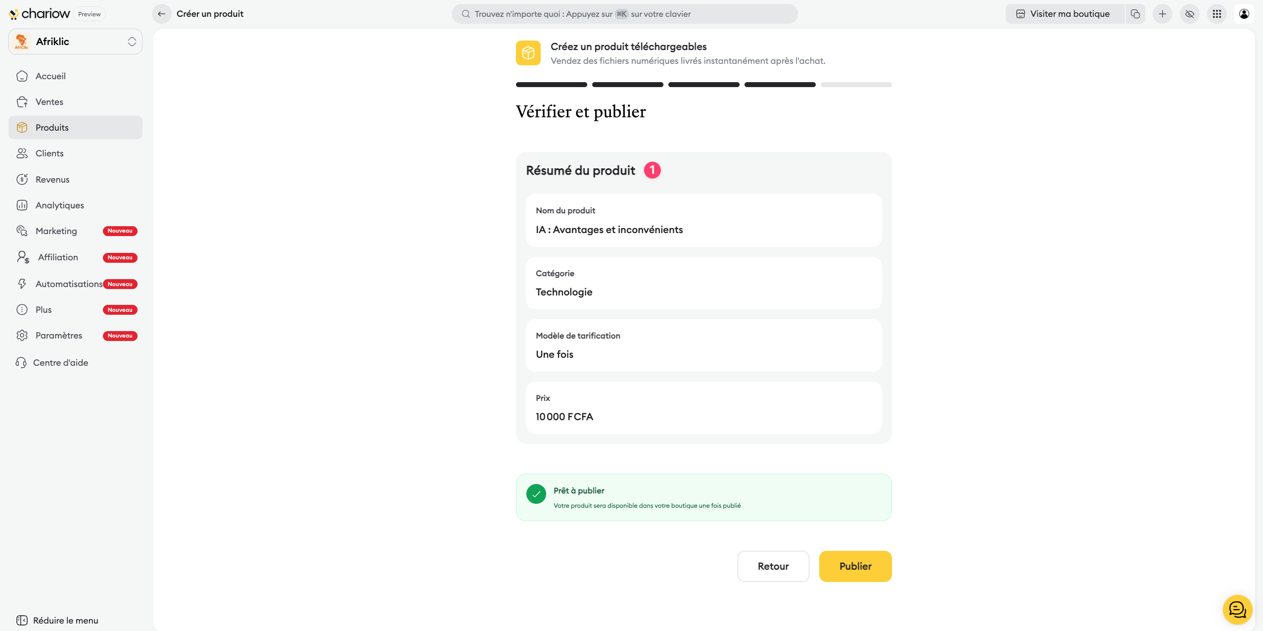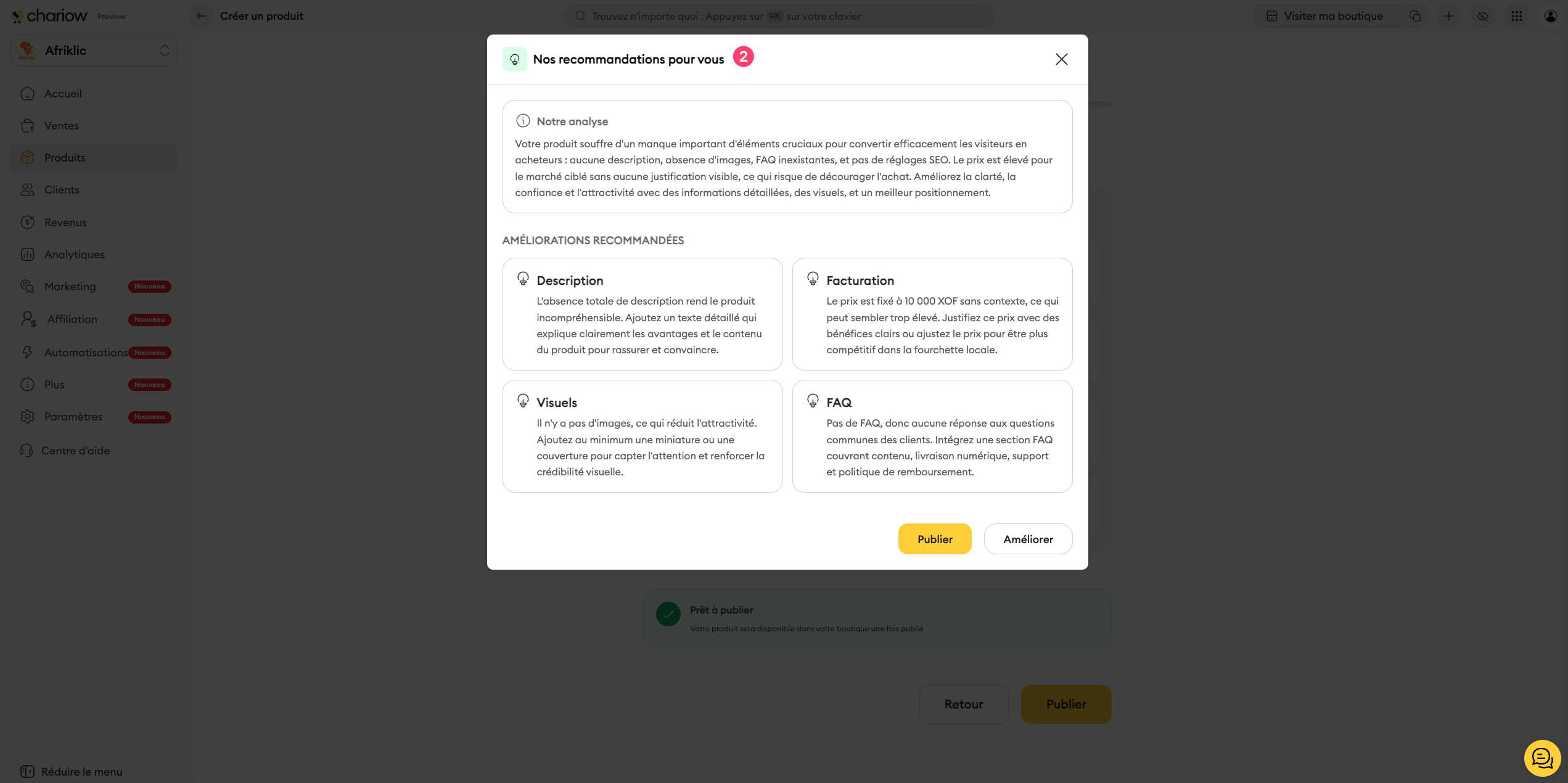 Action immédiate : si vous souhaitez prendre en compte les retours de l'IA tout de suite, cliquez sur "Améliorer". Sinon, cliquez sur "Publier" pour mettre le produit en ligne immédiatement.