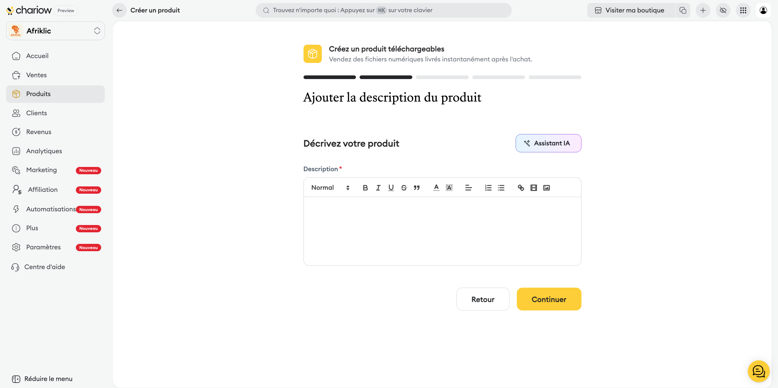 Assistant IA : vous pouvez solliciter l'aide de l'intelligence artificielle pour générer un texte de vente efficace.