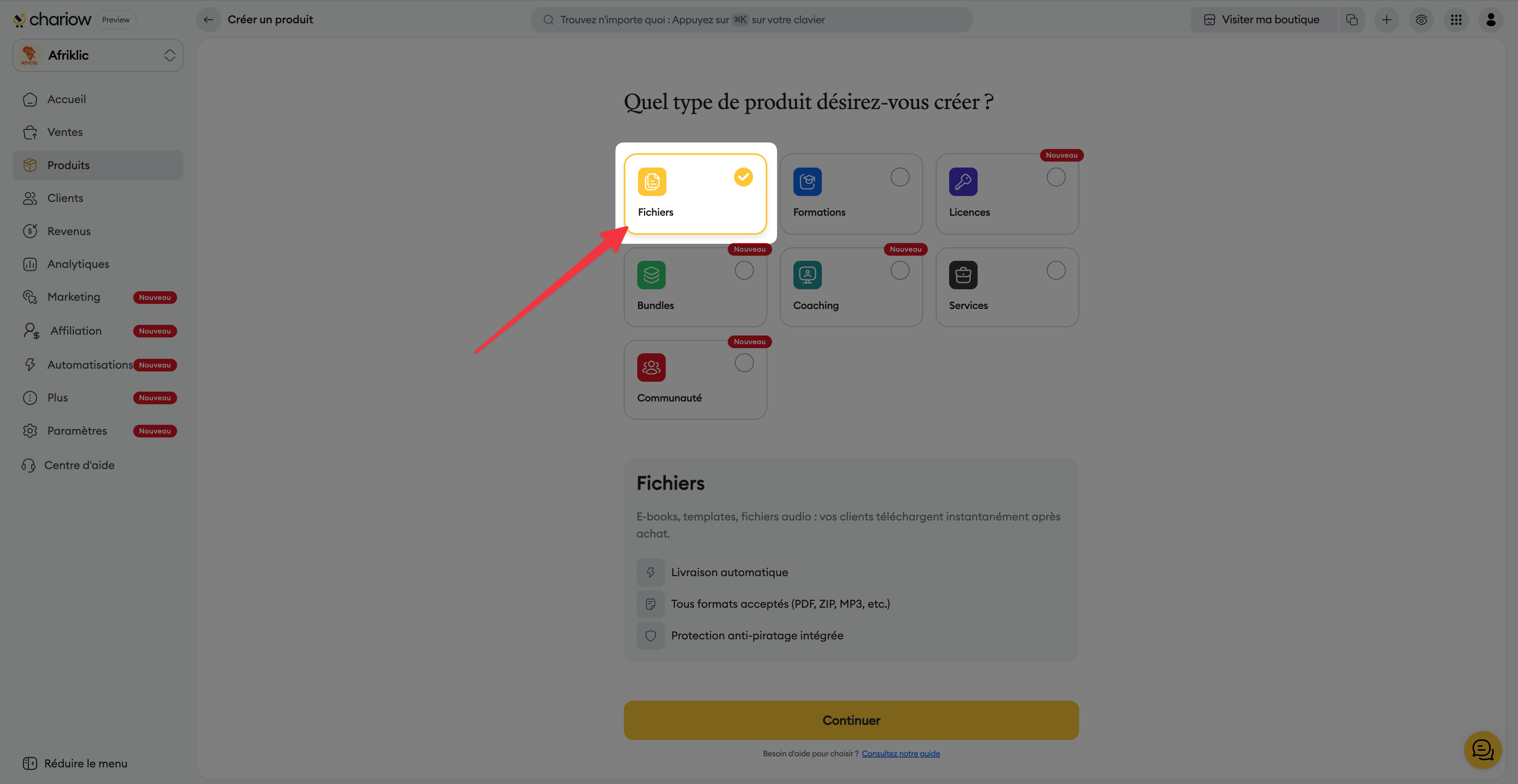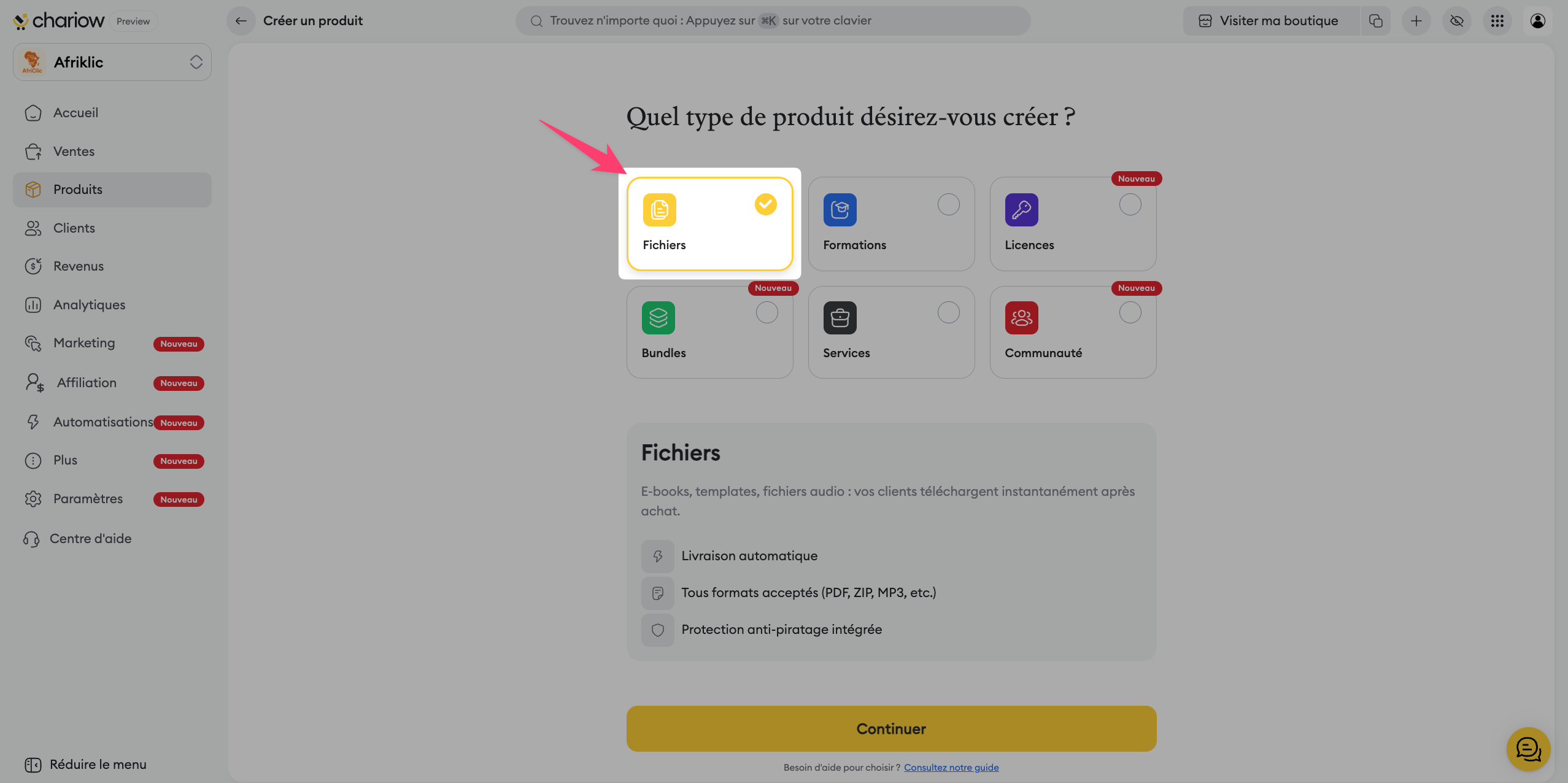 Le type de produit Fichiers sur Chariow est spécifiquement conçu pour les créateurs souhaitant vendre des ressources numériques livrées instantanément après l'achat. Ce parcours de création est optimisé pour garantir une expérience fluide tant pour le vendeur que pour l'acheteur, tout en assurant la sécurité de vos contenus digitaux.