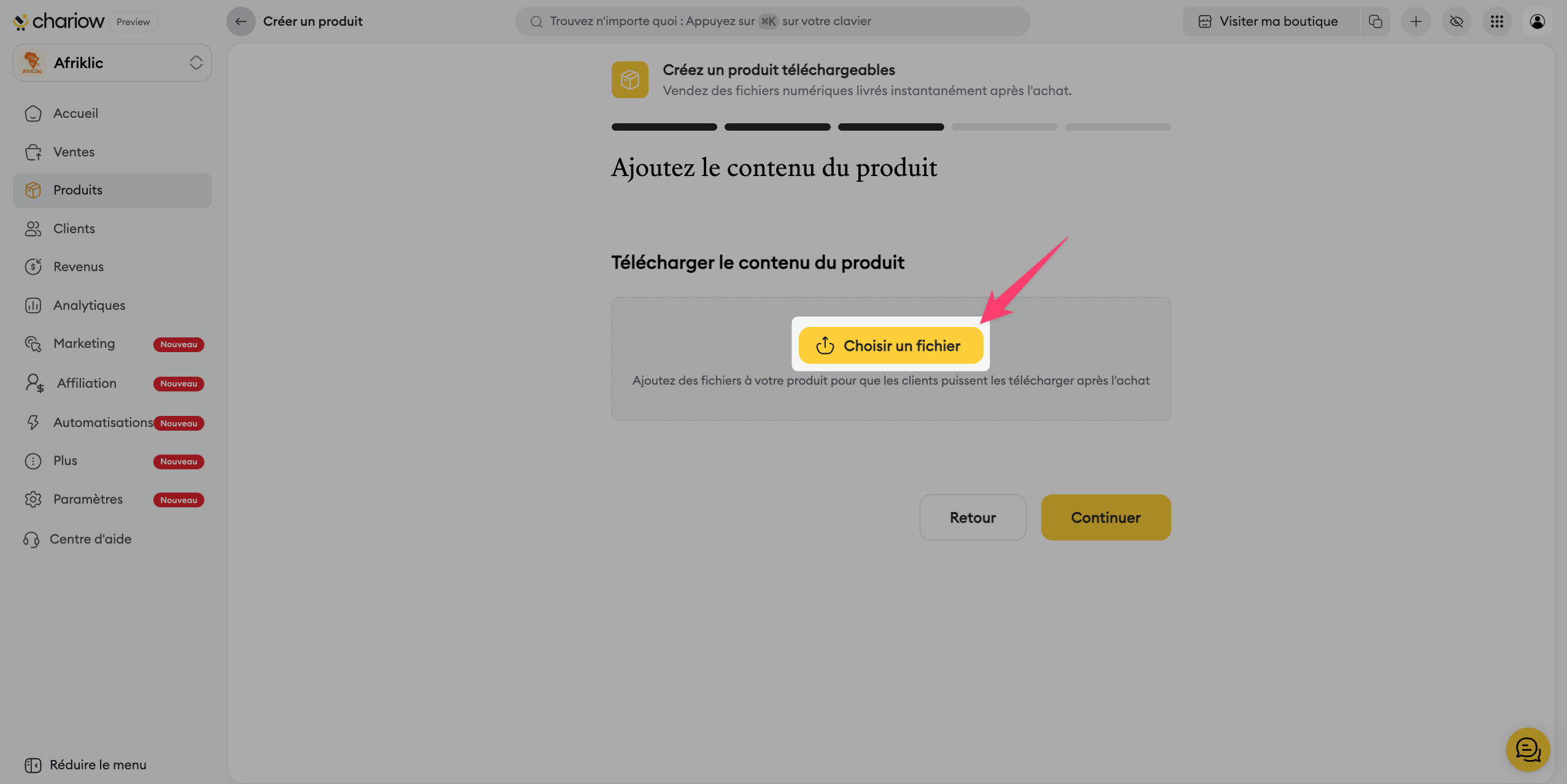 Téléchargement : cliquez sur "Choisir un fichier" pour uploader la ressource que vos clients recevront après leur achat.