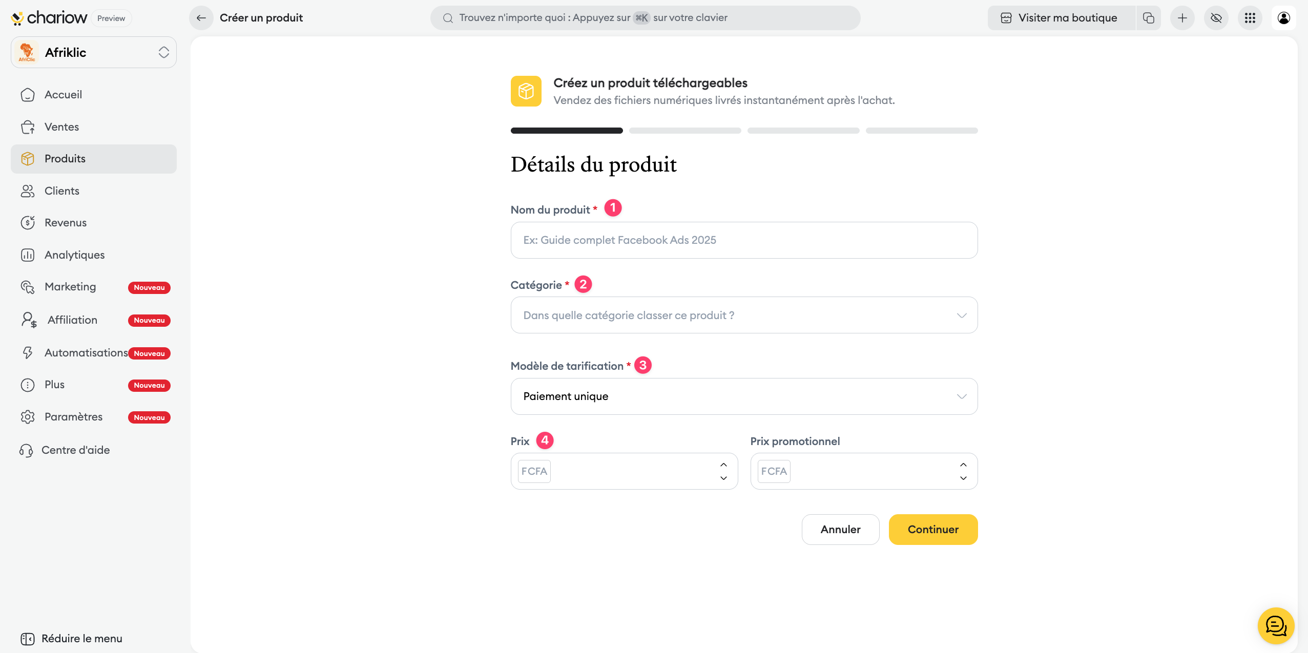 Nom du produit : saisissez un titre explicite pour votre article (ex: Guide complet Facebook Ads 2025).