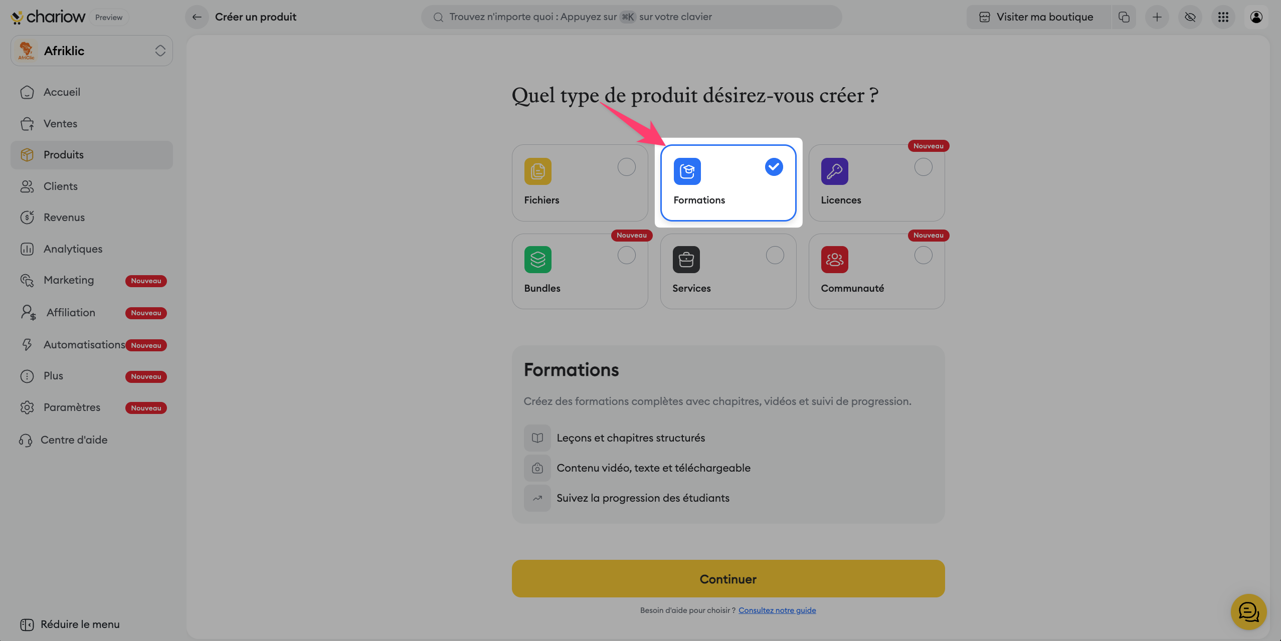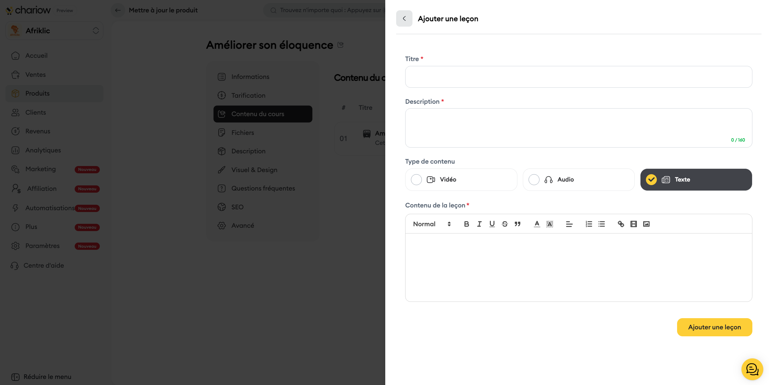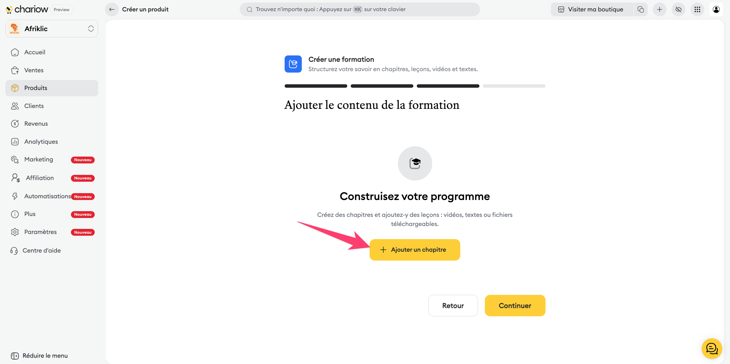 Le type de produit Cours sur Chariow est conçu pour les créateurs souhaitant structurer leur savoir en chapitres et leçons. Ce parcours est optimisé pour offrir une expérience d'apprentissage fluide et professionnelle à vos étudiants.