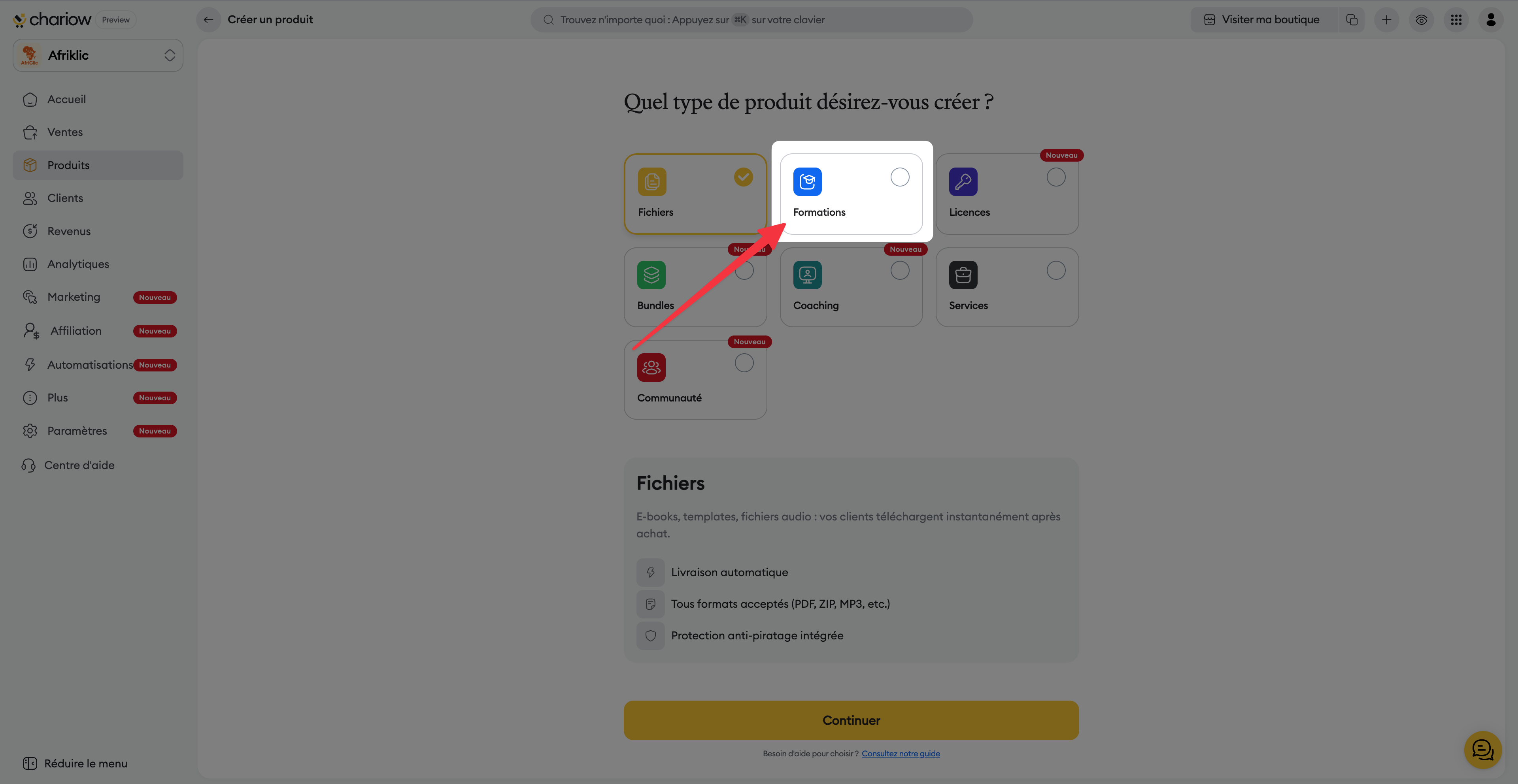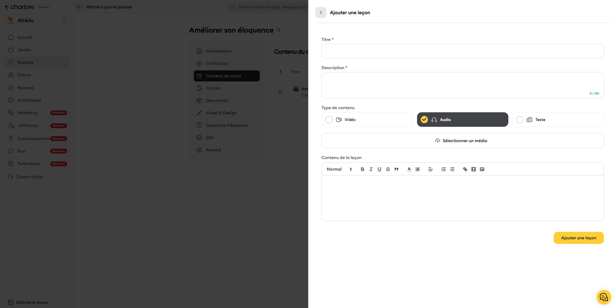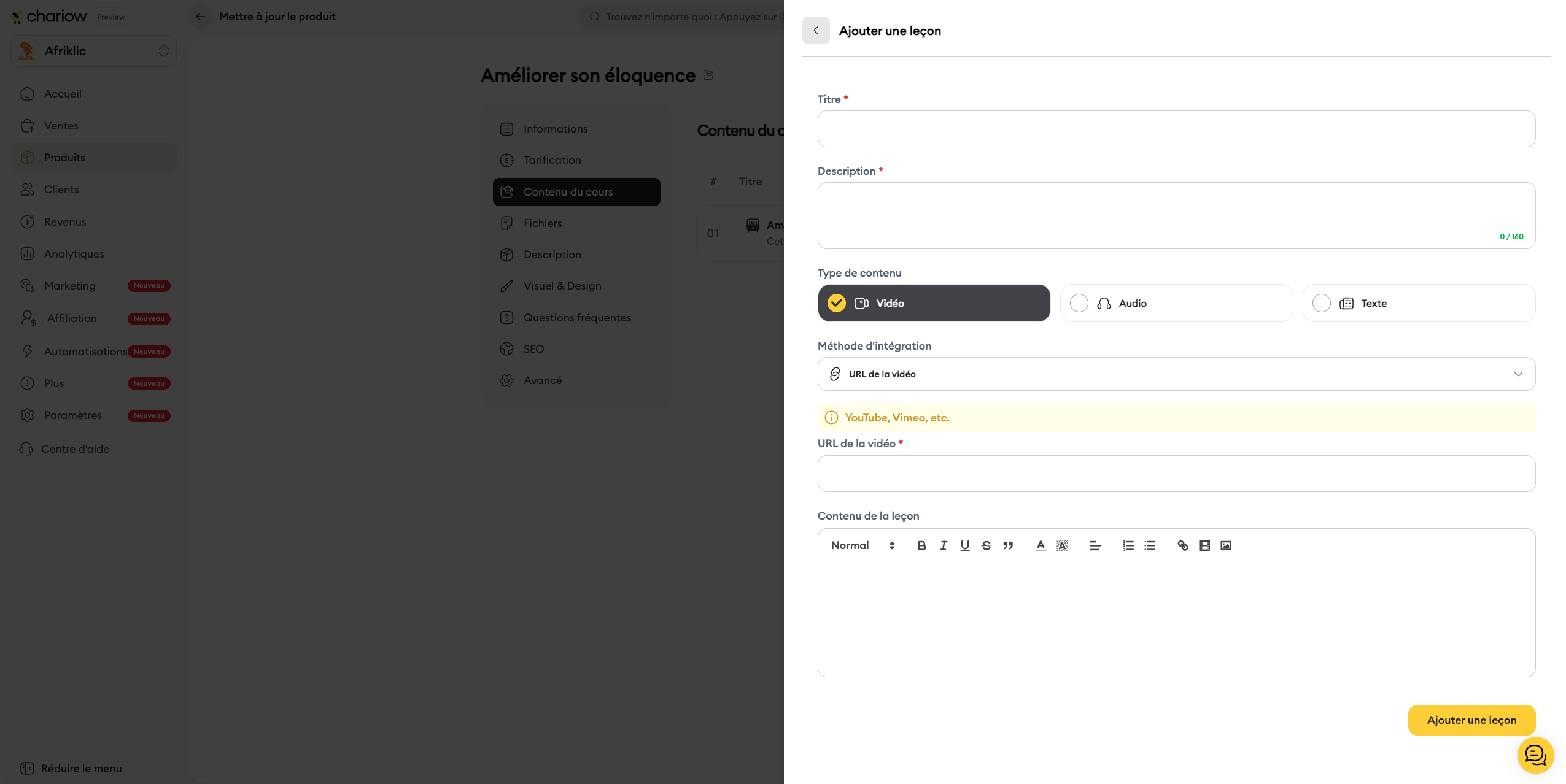 Le type de produit Cours sur Chariow est conçu pour les créateurs souhaitant structurer leur savoir en chapitres et leçons. Ce parcours est optimisé pour offrir une expérience d'apprentissage fluide et professionnelle à vos étudiants.