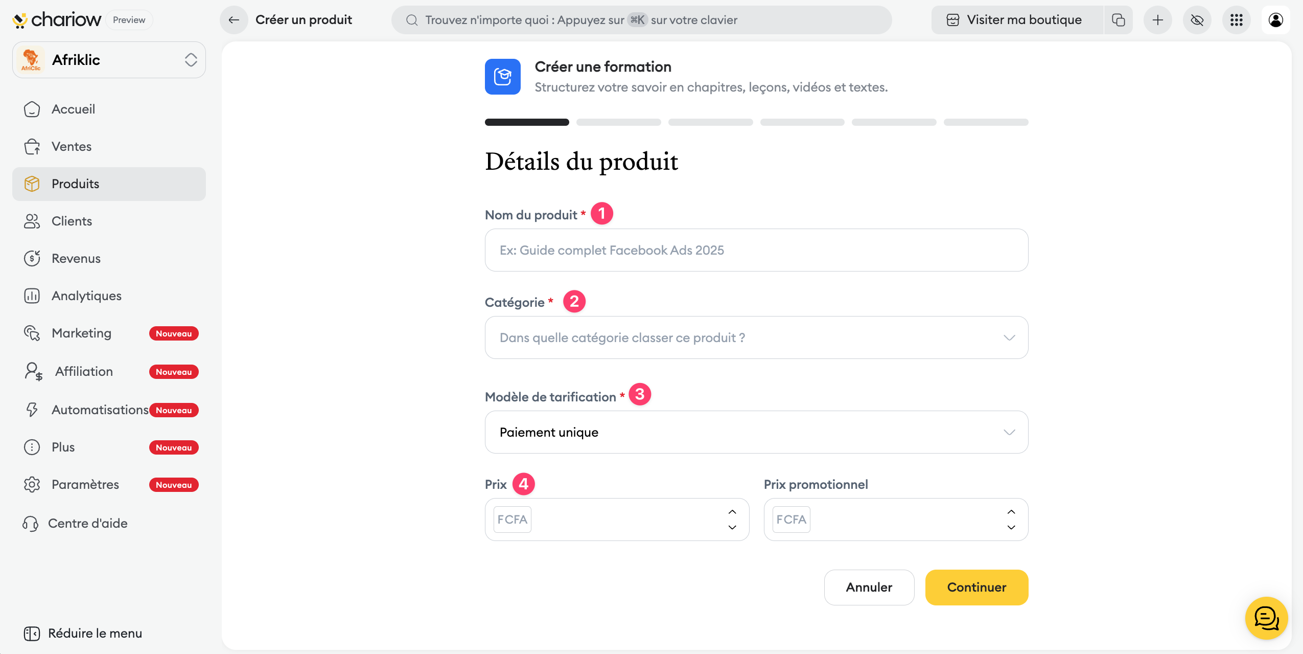 Nom du produit : saisissez un titre explicite (ex: Formation complète Art numérique).