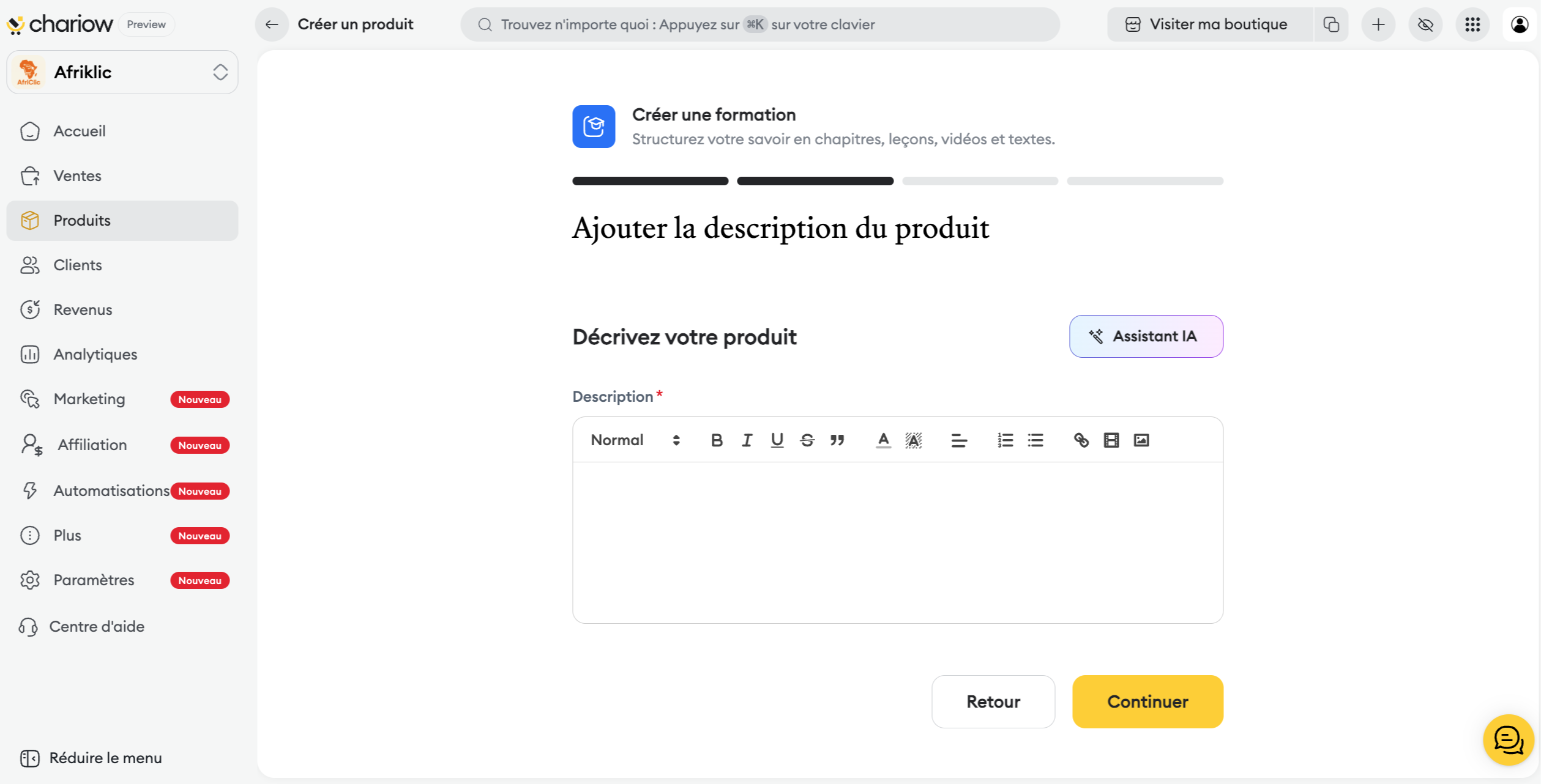 Assistant IA : vous pouvez solliciter l'aide de l'intelligence artificielle pour générer un texte de vente efficace.