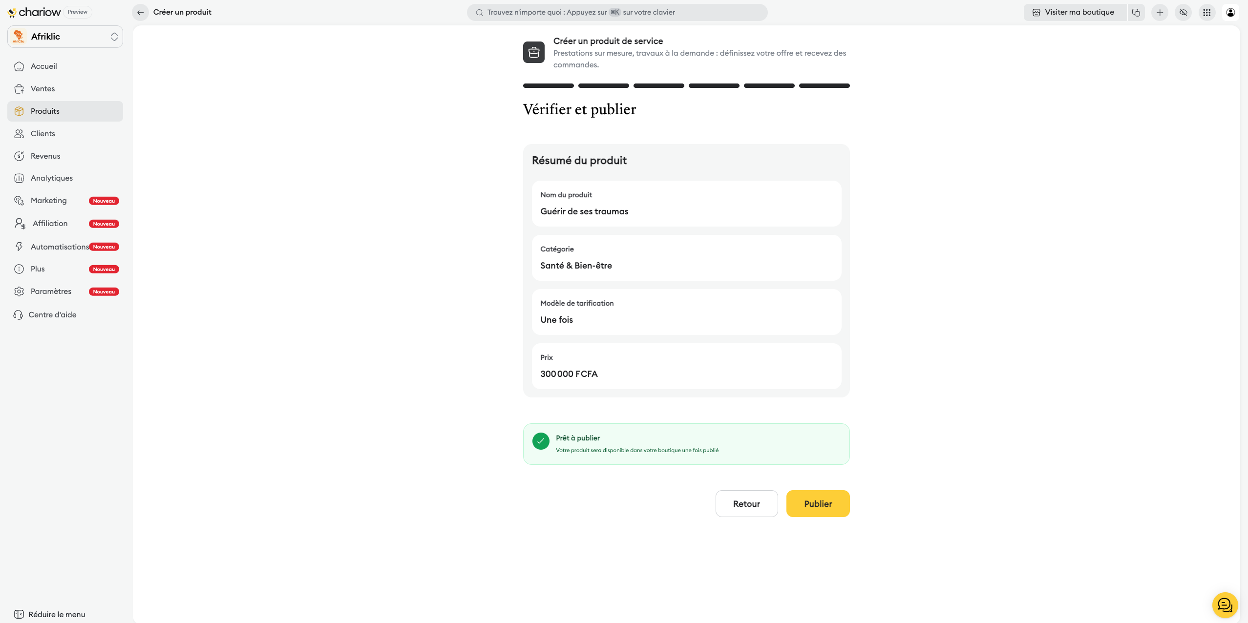 Résumé du produit : Validez une dernière fois les informations clés telles que le nom, la catégorie, le modèle de tarification et le prix.