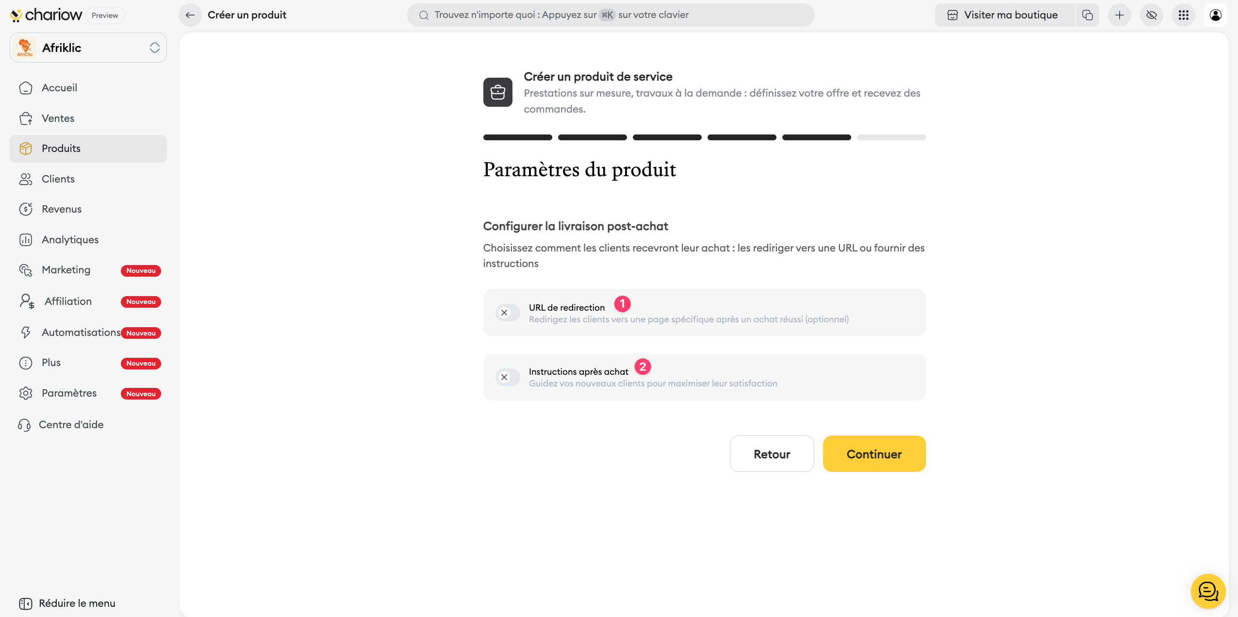 URL de redirection : Redirigez optionnellement vos clients vers une page spécifique (ex : un calendrier de réservation) après un achat réussi.