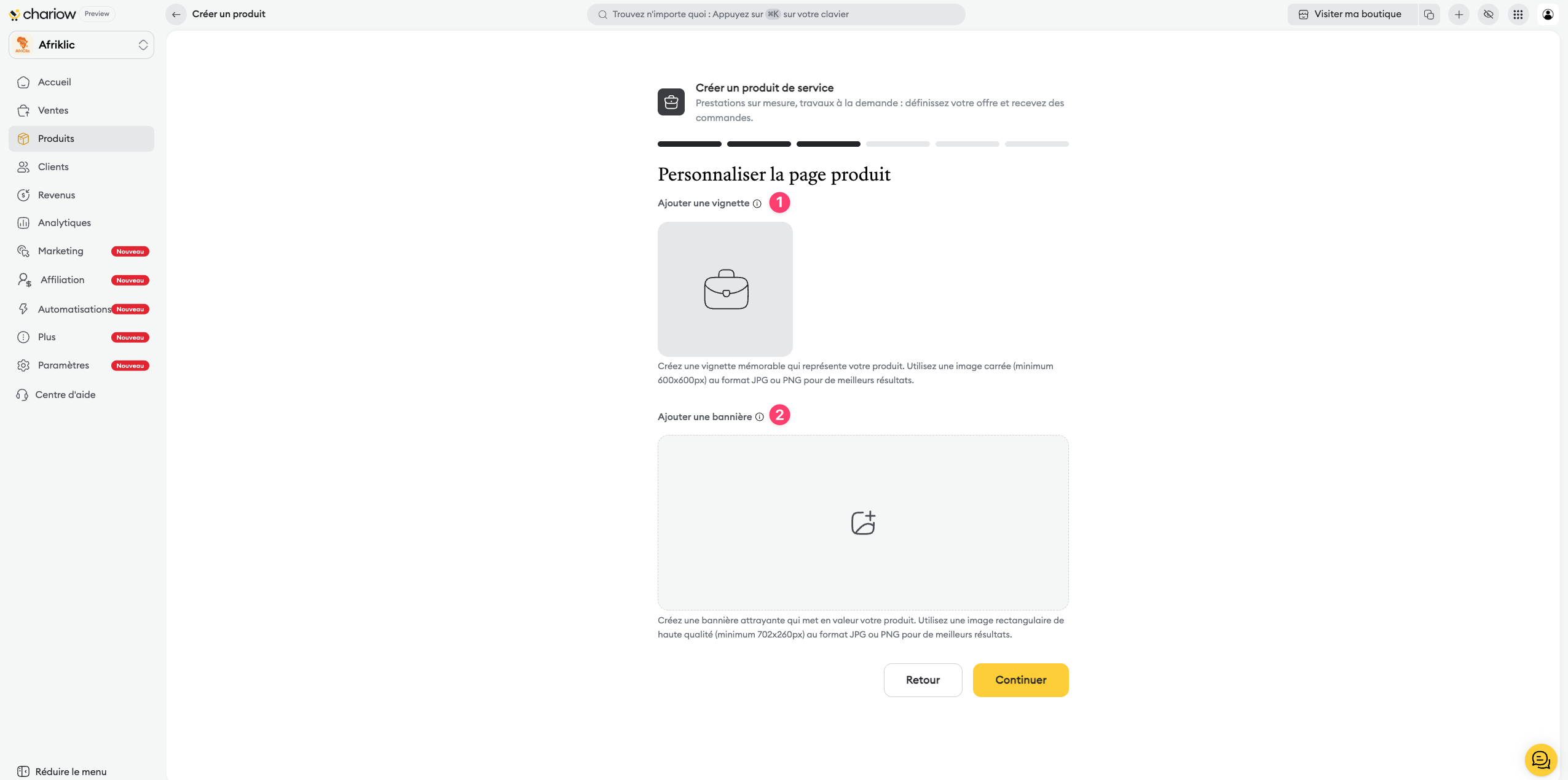 Bannière : Téléchargez une image rectangulaire de haute qualité (minimum 702x260px) pour habiller le haut de votre page de vente.