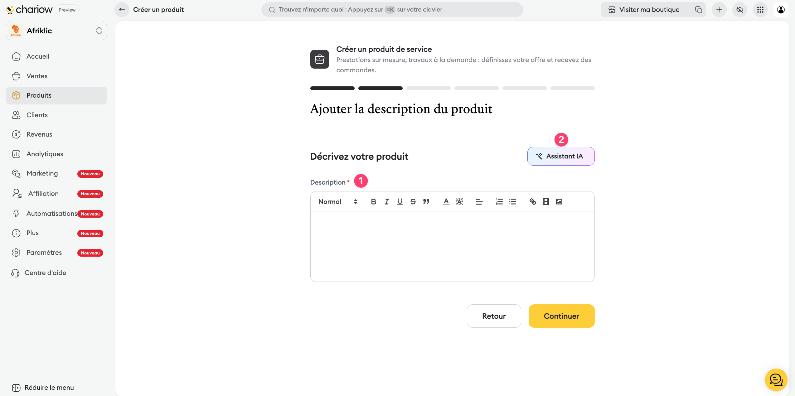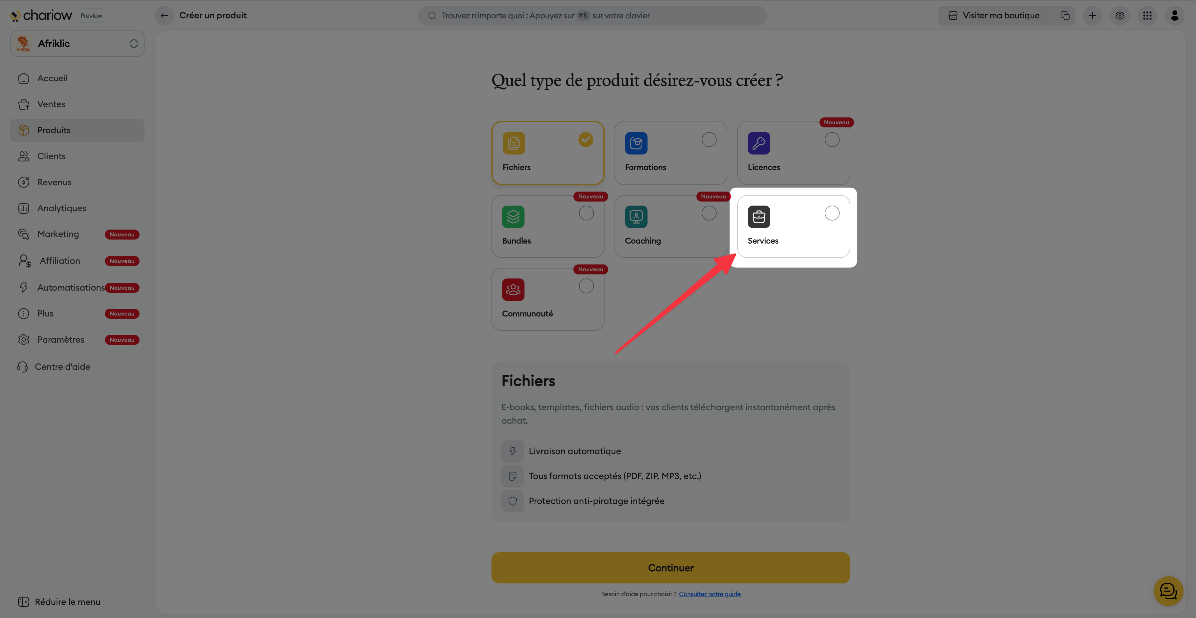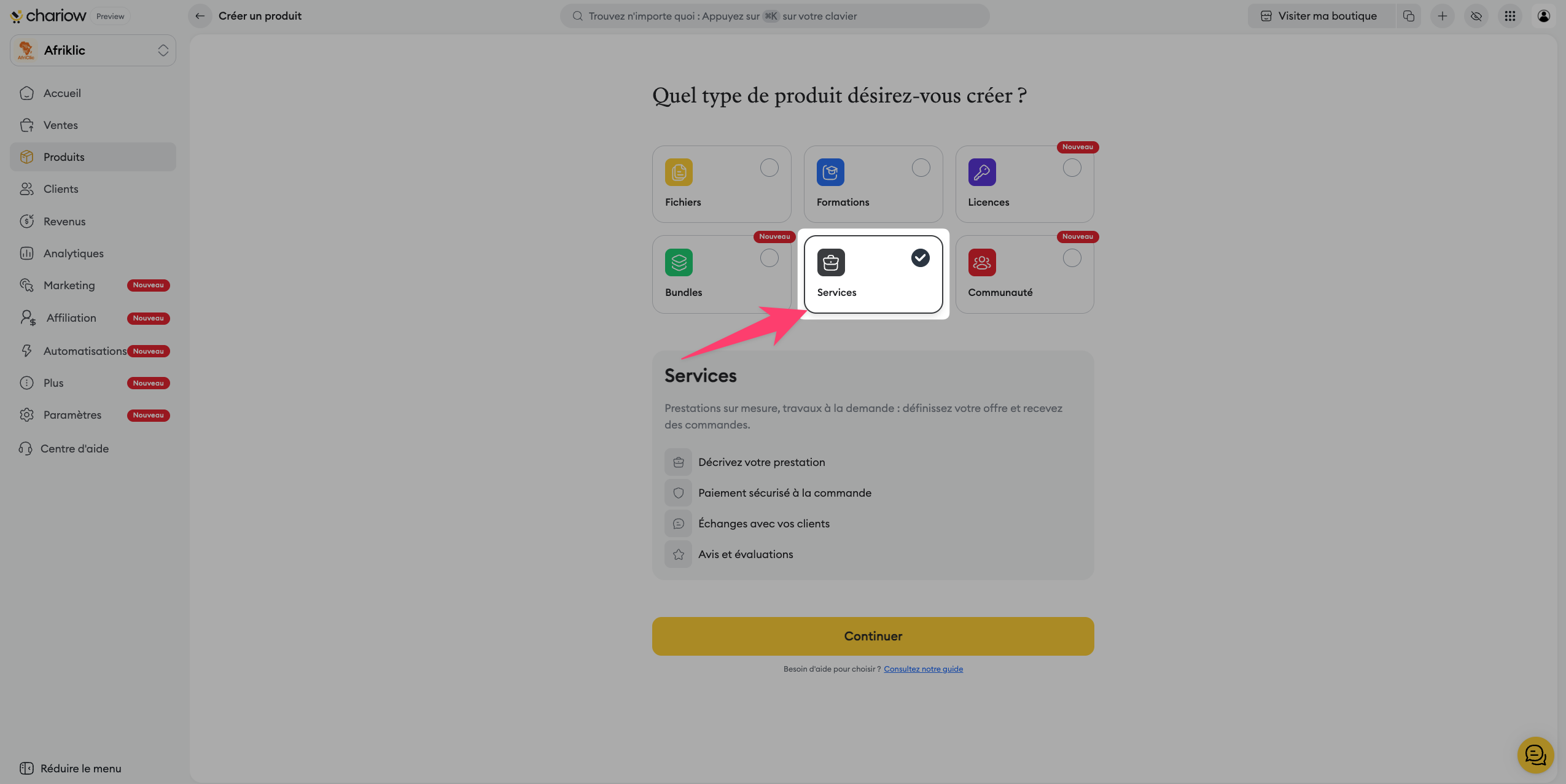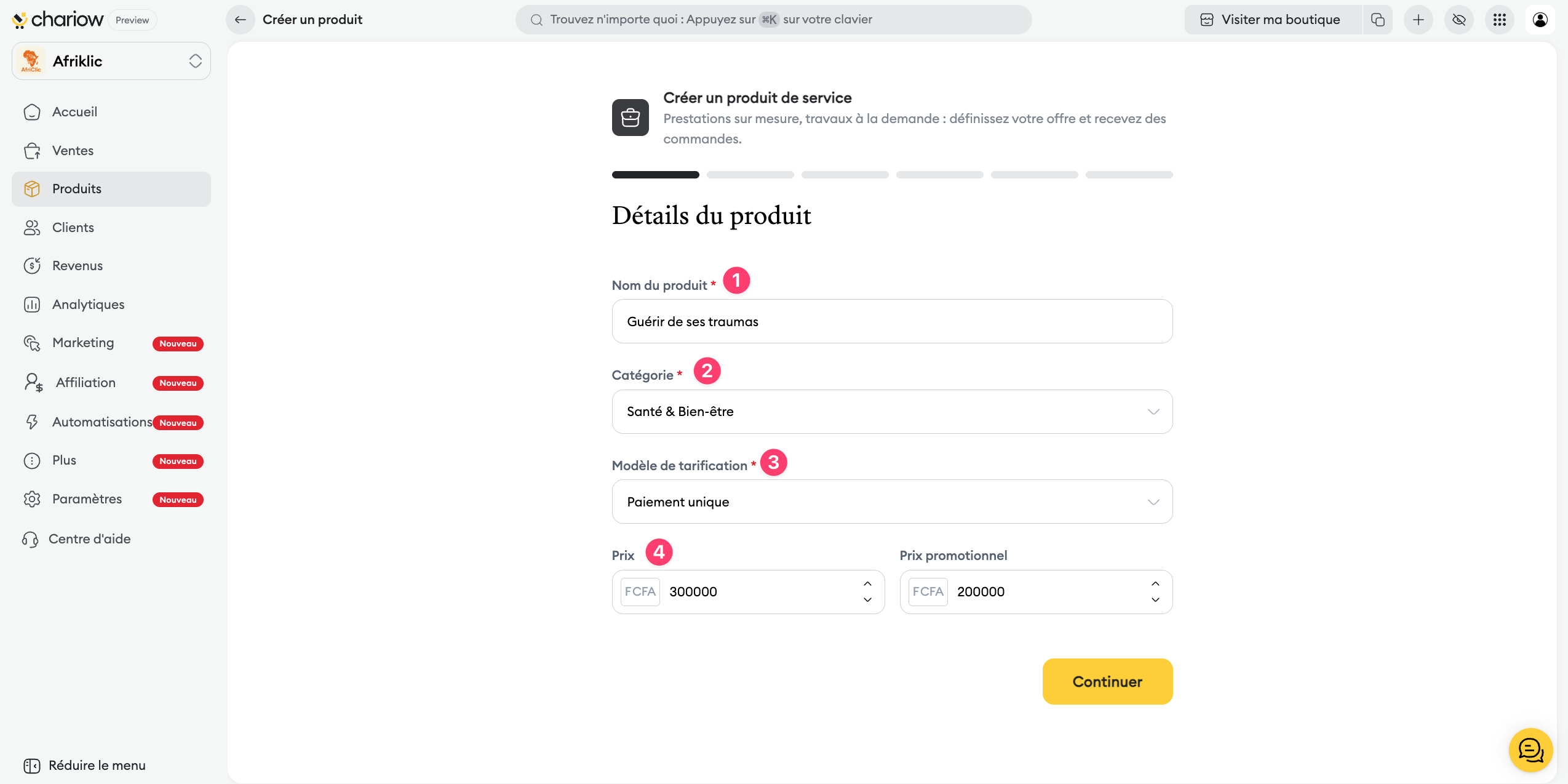 Le type de produit Service est conçu pour les créateurs proposant des prestations sur mesure ou des travaux à la demande qui nécessitent un échange direct ou un travail personnalisé, comme un audit, du coaching, ou du design. Contrairement aux produits numériques, la livraison ici correspond à la réalisation de votre prestation après réception de la commande.