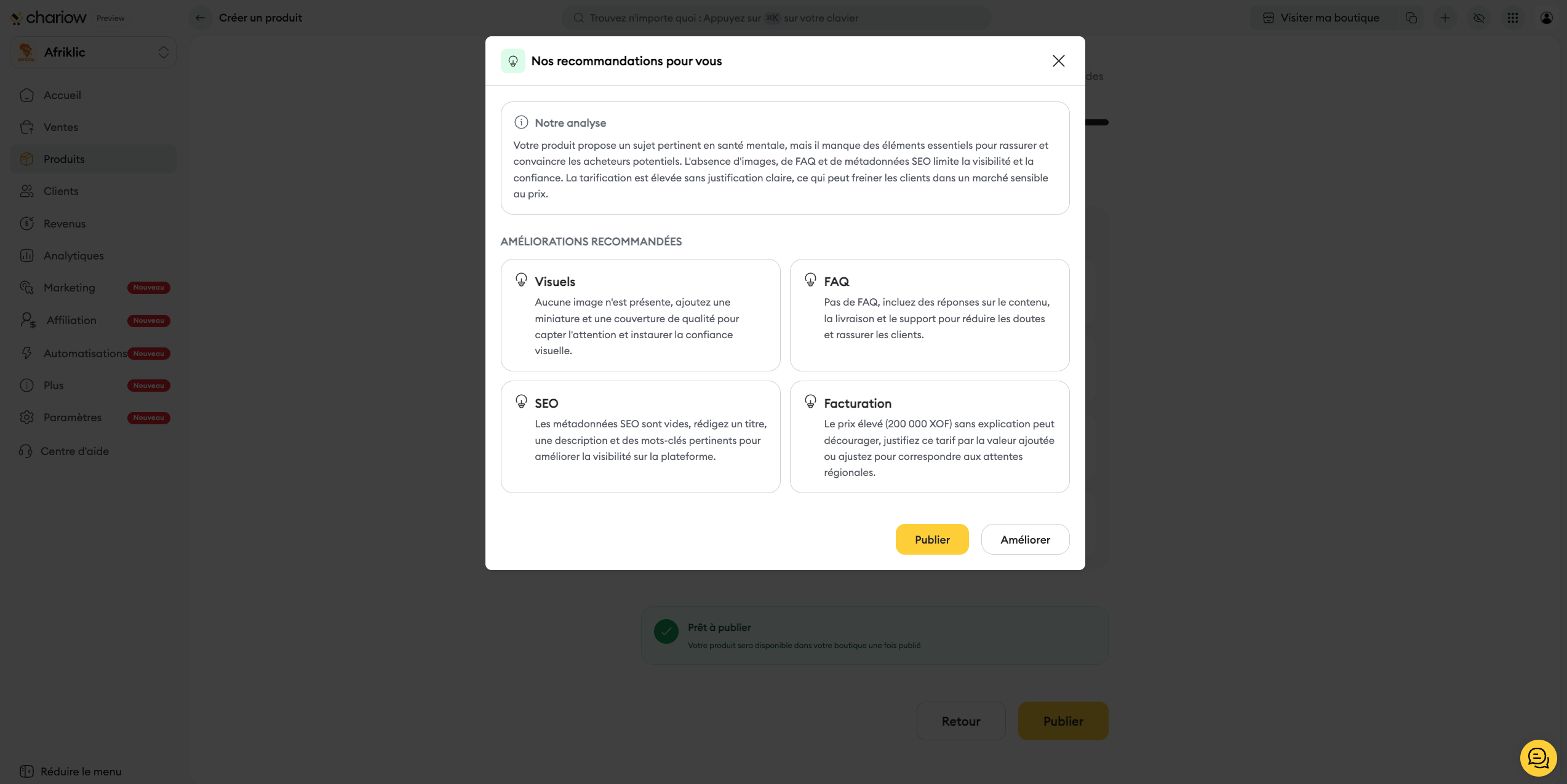 Action finale : Cliquez sur Améliorer pour suivre les conseils de l'IA, ou sur Publier quand même pour rendre le service disponible immédiatement.
