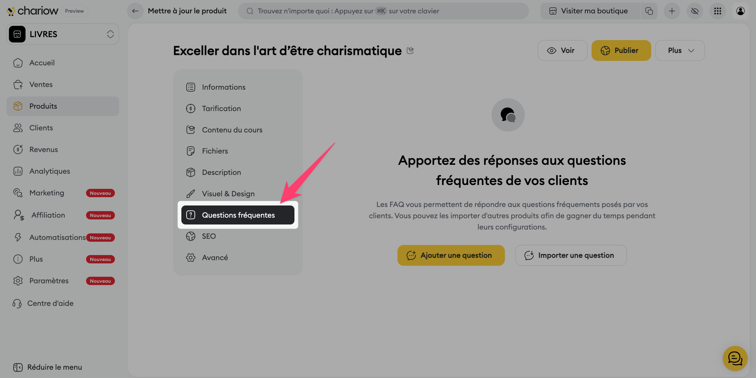 Anticipez les doutes de vos clients en ajoutant une section FAQ directement sur votre page de vente. Vous pouvez créer vos propres questions ou en importer d'autres produits pour gagner du temps.